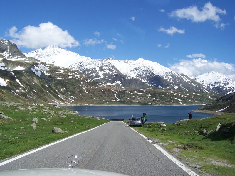 Nach dem Abstieg (aufgrund von Straßensperrungen ging es teilweise über die alte Paßstraße) fuhren wir auf der Autobahn weiter. Wir hatten die italienischsprachige Schweiz erreicht. Gomez horchte wieder fleißig an der Kopfstütze, während ich die ersten Züge des italienischen Fahrstils genoß. Wir fuhren weiter zum San Bernadino, der auch mittels Paßstraße genommen werden sollte. Vor dem Paß aßen wir im Paßdorf zu Mittag (Pizzeria Postiglione, 6565 San Bernadino – sehr zu empfehlen!).