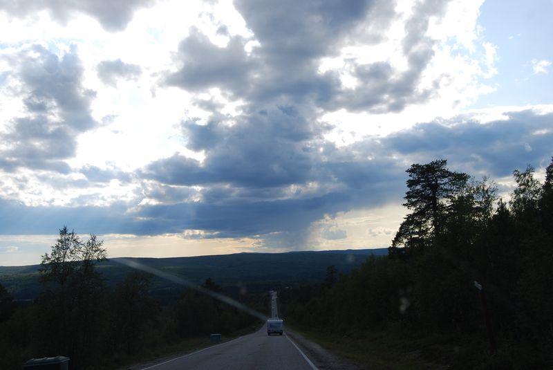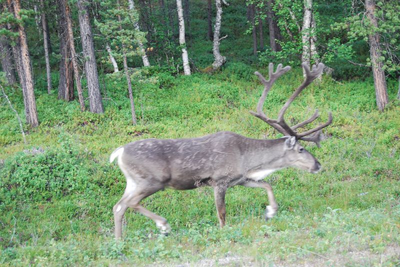 Der Weg führte durch den finnischen Wald zum Inarijärvi. Wir hielten noch ein paar Mal zum Einkaufen und Essenfassen an, bemühten uns aber, zügig voranzukommen. Hinter Sodankylä kam es beinahe zu einer rentierbedingten Fahrzeugkollision. Ich konnte nur ausweichen, weil die Rentierherde sich in einer Senke überlegt hatte, über die Straße zu gehen und ich daher die Gegenfahrbahn zum Ausweichen benutzen konnte, von der ich mich vergewissern konnte, daß sie frei war. Es regnete in Strömen und so hätte ich ohne Ausweichmöglichkeit wohl in Tobys Wohnwagen parken müssen.