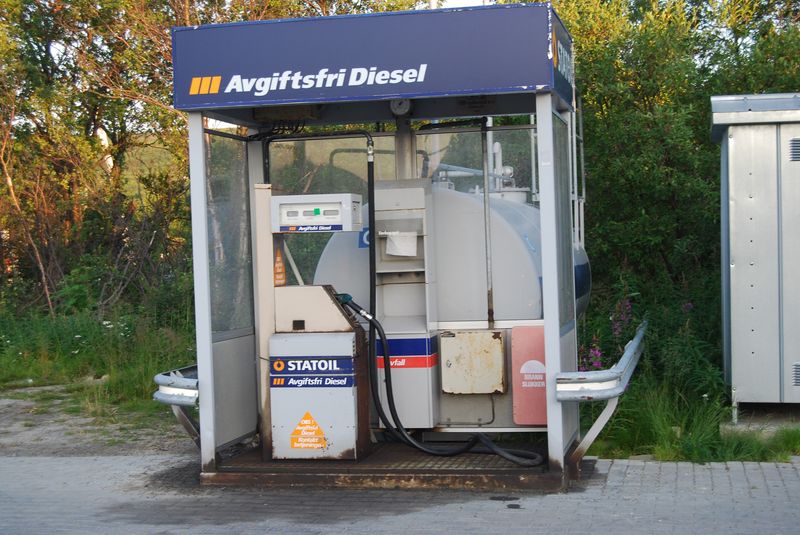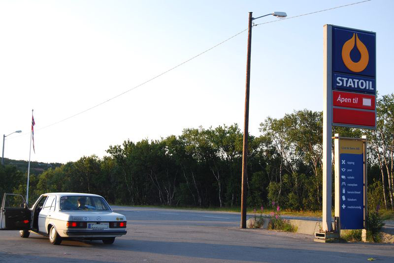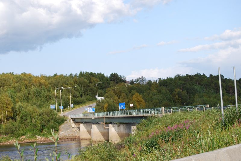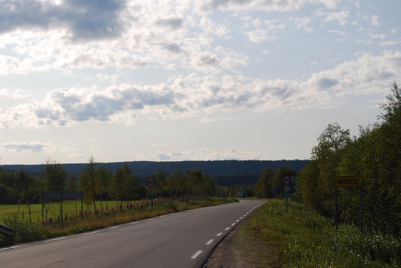 Wir nahmen eine Brotzeit in einem Burgerladen ein und tankten den Wagen mit Pflanzenöl voll. Dabei achtete ich nicht richtig auf den Trichter und es ergoß sich eine stattliche Menge Öl über den Boden des Restaurantparkplatzes. Da mein Finnisch leider nicht ausreichte, um dem Parkplatzbesitzer die Ungefährlichkeit der Flüssigkeit zu erklären, beschloß ich, die Flucht nach Norwegen anzutreten. Ich gab Toby und Anke den Befehl der unauffälligen Weiterfahrt. Das Öl, das durch den Abfluß in der Tankklappe floß, war noch nicht unter dem Auto hervorgedrungen. Wir packten wieder zusammen, stiegen wie selbstverständlich ein und verließen die Szenerie. Nach 500 Metern und einer Brücke waren wir in Norwegen und trafen uns mit Toby und Anke an einer Haltebucht.