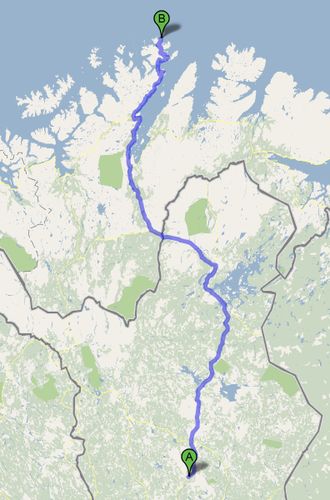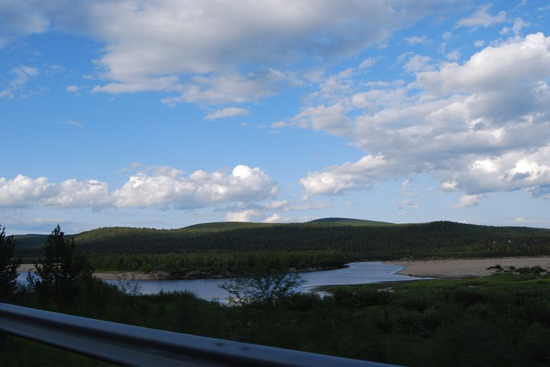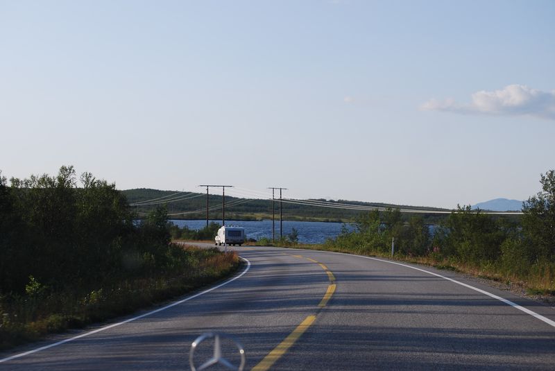 An einem Supermarkt in Inari entledigte ich mich eines leeren Plastikkanisters. Dieser soll später noch eine Rolle spielen. Besonders gefiel mir die Straße 92 von Inari nach Karigasniemi. Sie führte über knapp 100 km durch die Mitte von Nirgendwo. Es ging ständig bergauf und bergab, aber nie so sehr, daß man seine Geschwindigkeit von 80-90 km/h drosseln müßte oder der Wagen Schwierigkeiten hatte, den Hügel hochzukommen. Es war ein bißchen wie eine ganz große Achterbahn.