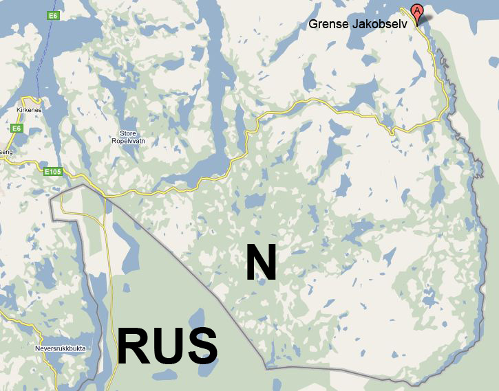 Grense Jakobselv ist ein ehemaliger Fischerort, der im äußersten Nordosten Norwegens liegt. Eine ungefähr 50 km lange Straße führt von Kirkenes dorthin. Die Straße endet an der Barentssee. Auf dem Weg dorthin fährt man ein gutes Stück direkt am Grenzfluß zwischen Norwegen und Rußland entlang. Man steht am gelben norwegischen Grenzpfahl, blickt 2 Meter die Böschung runter, über den 5 Meter breiten Fluß und sieht dann den rot-grünen russischen Grenzpfahl. In der tiefsten Stelle des Flusses verläuft die Grenze.