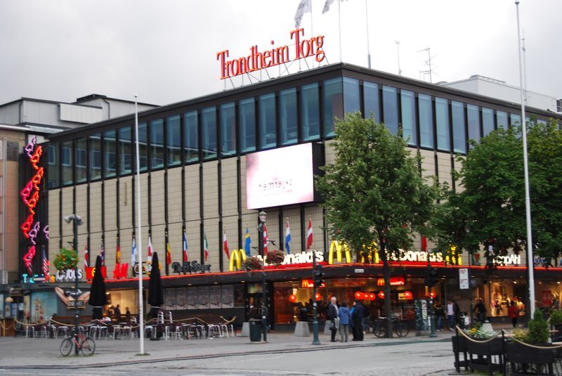 Gegen 18 Uhr waren wir in Storlien, unweit der Grenze. Ich erkannte, daß es ein Fehler war, bis hierhin mit dem Tanken zu warten. Hier hatte man sich wohl auf die norwegischen Tanktouristen eingestellt und der Sprit war deutlich teurer als an den Tankstellen, die wir auf dem Weg von Östersund hierher sahen. Zähneknirschend ließ ich den Tank und einen Wehmachtskanister mit schwedischem Diesel vollaufen und zahlte umgerechnet etwa 1,18 EUR /L. 61 Liter paßten in den Tank, 20 in den Kanister. 981 SEK wurden von der VISA-Karte abgebucht. An der Kasse mußte ich länger warten, da eine norwegische Familie ihren Monatsvorrat Fleisch in Form von riesigen T-Bone-Steaks einkaufte. Sie ließen umgerechnet fast 300 Euro an der Kasse. Es muß sich dennoch gelohnt haben, bei der Menge, die sie in ihre Einkaufstüten lud. Wenige Momente später waren wir wieder in Norwegen. An der Grenze war niemand. In Stördal trafen wir wieder auf die wohlbekannte Europastraße E6. Schon auf dem Weg von hier nach Trondheim mußte ich 10 oder 20 NOK in ein Mauthäuschen einwerfen. Wir fuhren nach Trondheim hinein und wollten unser Hungergefühl stillen. Dafür hielten wir entlang der Einfallstraße an einem Einkaufscenter. Die dortigen Preise – zum Beispiel umgerechnet 15 Euro für einen Hamburger – verschreckten uns aber alsbald, sodaß wir unseren Weg fortsetzten. In der Trondheimer Innenstadt angekommen fand sich wider Erwarten ein kostenloser Parkplatz, wir liefen anschließend ein wenig umher.