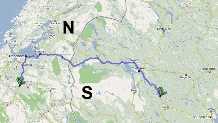 Wir schliefen wieder bis nach 12 Uhr. Es ging wieder zurück zur Hauptstraße und in Richtung Östersund. Wir bretterten die E14 durch und kamen ohne Zwischenhalt zur schwedisch-norwegischen Grenze. Ich wollte noch im vergleichsweise günstigen Schweden tanken und befragte das Navi nach den auf dem Weg liegenden Tankstellen. Ich wählte die grenznächste Tankstelle in Storlien aus.
