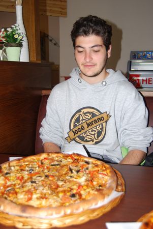 Jedenfalls verdient besagte Pizzeria es, dass man ein paar Sätze über sie an dieser Stelle verliert. Da wir mittlerweile einen Eindruck von den Preisen in der norwegischen Gastronomie hatten, stellten wir uns auf das Schlimmste ein. Dennoch wollten diesmal nicht knauserig sein, was wohl v. a. was mit dem unerträglichen Hunger zu tun gehabt haben könnte. Es gab zwei Pizzagrößen: „groß“ und „klein“. Wir bestellten jeweils „groß“, in der Annahme, dass der Halsabschneider hinter der Theke uns jetzt so ein mittelgroßes Stück Teig auf den Tisch legen würde. Unsere Erwartungen wurden jedoch bei weitem übertroffen und ich hatte für einen Augenblick sogar den Eindruck, dass der Durchmesser der Pizza mit dem eines LKW-Reifens vergleichbar wäre. Das ganze musste fotografisch für die Nachwelt dokumentiert werden, in der Hoffnung, dass deutsche Pizzabuden sich ein Vorbild daran nehmen würden. Nach der Hälfte war Schicht im Schacht und wir ließen uns den Rest einpacken. Das hat sich doch mal richtig gelohnt.