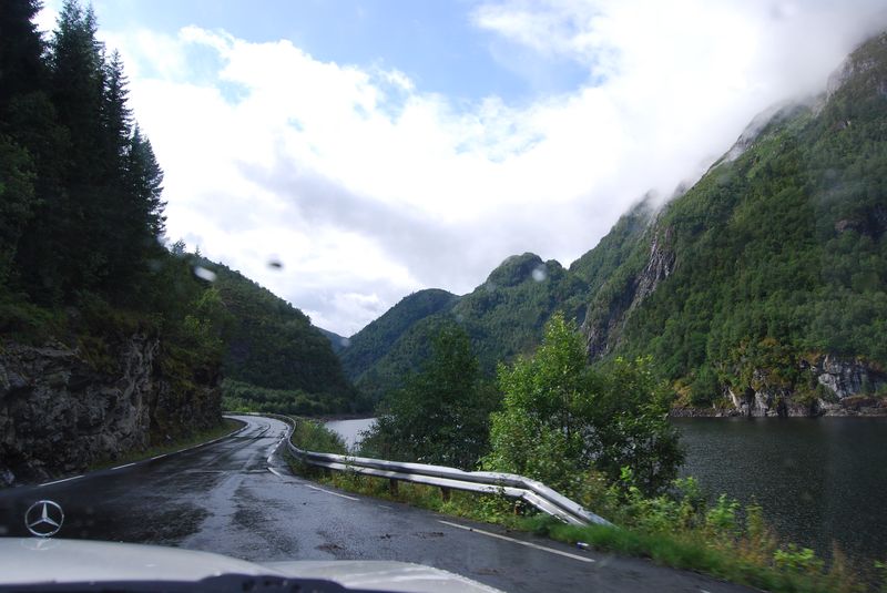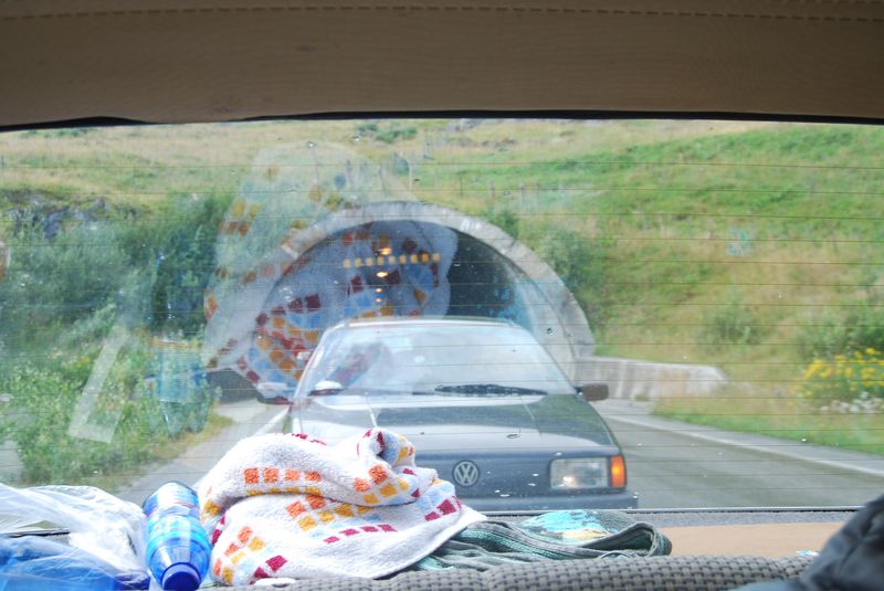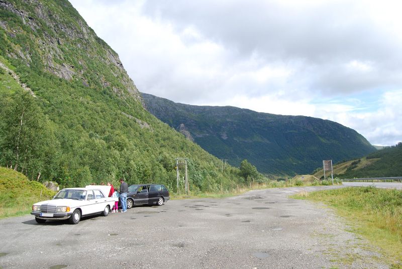 Auf einmal standen an einer Mautstation. Die Durchfahrt sollte 180 NOK kosten. Für was, das wußte ich nicht. Ich zahlte mangels Alternative. Es folgten sechs oder sieben Tunnel mit mehreren Kilometern Länge. Ich vermute, hier werden wie am Nordkapptunnel die Baukosten mit Maut refinanziert und dieselbe wird abgeschafft, sobald alles bezahlt ist. Im vorletzten Tunnel stand ein VW Passat am Straßenrand. Ich hielt an – ich hatte ja Zeit. Eine fünfköpfige Familie war hier liegengeblieben. Ich fragte auf Englisch nach, was denn passiert war und der bestimmt gerade erst 10-jährige Junge war der einzige der mich verstand. Er zeigte auf den Kühlwasserbehälter und erklärte, daß da was kaputt sei. Ich bot der Familie an, sie mit dem Abschleppseil aus dem Tunnel zu schleppen, in dem es höllisch laut war. Der Vater hegte Zweifel, ob mein Auto das schaffen würde. Schließlich ging es im Tunnel stark bergauf. Ich legte optimistisch das Abschleppseil an und es ging los. Vollgas im zweiten Gang ging es den Tunnel hinauf. Es funktionierte wunderbar. Nach zwei oder drei Kilometern erreichten wir das Ende des Tunnels und ich bog mit dem Passat am Abschleppseil auf einen Parkplatz ab. Die Familie war so dankbar wie ich Menschen selten erlebt hatte. Alle fünf dankten mir tausend mal. Ich vergewisserte mich, daß sie irgendwie Pannenhilfe bekommen konnten. Die Mutter erzählte mir in ihrem spärlichen Englisch, daß ihr Mann Marokkaner und ihre Mutter Polin sei. „A multinational family“. Wir unterhielten uns noch kurz – so gut es ging – über Deutschland und den Daimler (der marokkanische Vater fand das Auto verständlicherweise toll) und ich wollte mich dann verabschieden. Da drückte mich die Oma mit einer Freudensträne im Knopfloch und legte mir ungefragt 100 NOK in die Hand. Ich wollte eigentlich gar kein Geld, aber ich habe mal gehört, daß es in manchen Kulturen unhöflich sei, Geschenke abzulehnen, also nahm ich es an – schließlich wollte ich mich ja nicht wieder unbeliebt machen.