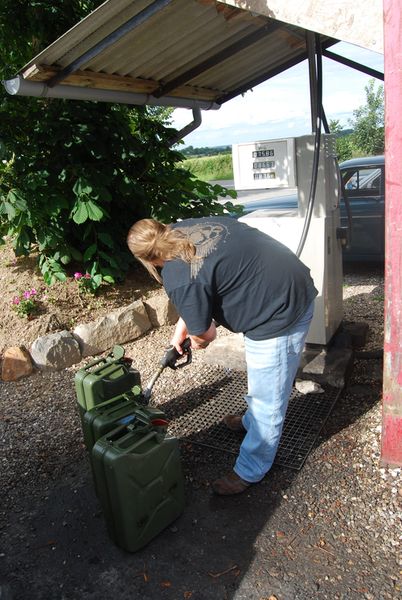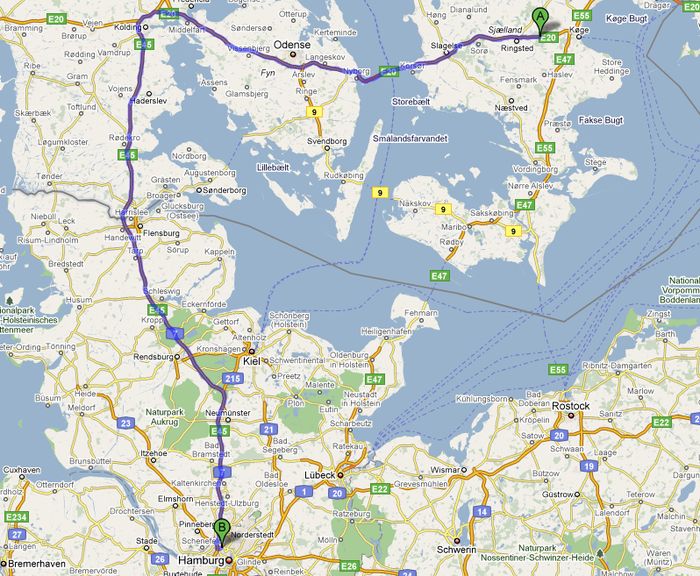 Anschließend fuhren wir zur Autoschmiede Ringsberg, wo man laut Internet Pflanzenöl tanken konnte. Ich hatte mir im Internetcafé am Geirangerfjord die Telefonnummer abgeschrieben und rief an, als wir durch Flensburg kurvten. Tatsächlich gab es dort den leckeren Lebenssaft, sodaß ich für 0,876 EUR /L bei Kilometerstand 297.561 den Tank und drei Wehrmachtskanister füllen konnte. Taylan rief seinen Freund in Hamburg an, wir meldeten ETA 18 Uhr in die Freie und Hansestadt und stellten das Navi auf die Adresse ein.