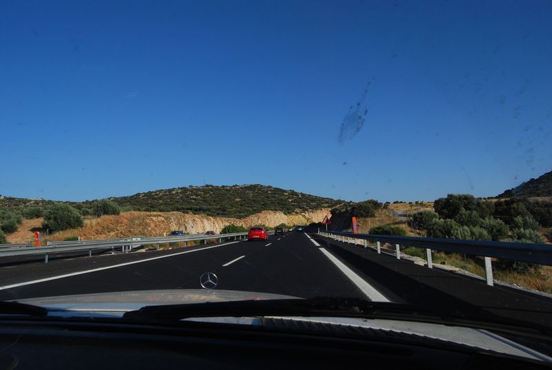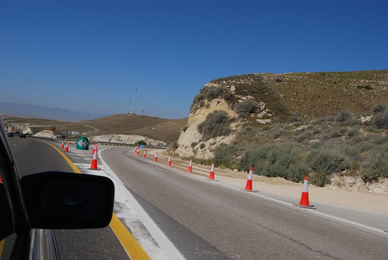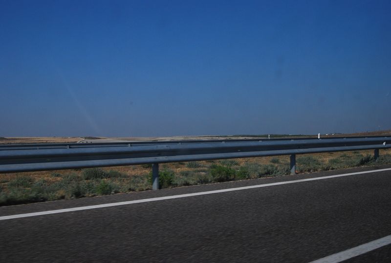 Die Sonne sengte unerbittlich, nicht daß wir vorher schon verschwitzt und verkeimt gewesen wären. Eine Dusche wäre angebracht und im Rasthof auch möglich gewesen, aber der Aufwand war zu groß als daß sich jemand dazu durchringen hätte können. Fragen, Koffer abschnallen, laufen, schwitzen, duschen, wieder anfangen zu schwitzen und Koffer wieder draufschnallen. Wir verschoben das ganze auf unsere Ankunft in Tarifa und gaben uns bis dahin unserem Schicksal geschlagen. Ich fühlte mich, immer noch schlaflos, doch wieder ganz fit und übernahm bis hinter Madrid. Hinter Zarazoga endete wie geplant die Maut, insgesamt waren wir in Spanien damit für die gesamte Landesdurchquerung knapp 35 EUR losgeworden. Ab sofort konnte man über die nicht immer einwandfrei aber doch sehr gut ausgebauten Autovias fahren, vergleichbar mit unseren vierspurigen baulich getrennten Bundesstraßen. Das Navi wurde entsprechend instruiert.