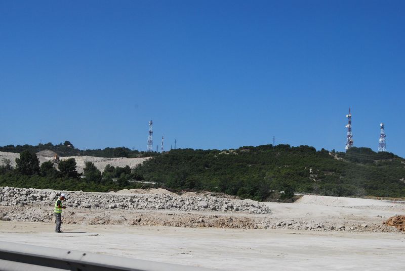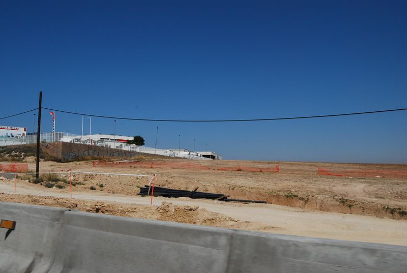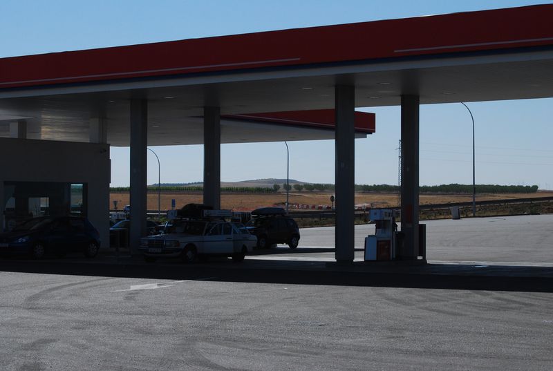 Weiter im Text: Kurz vor Zaragoza entschlossen wir uns zu einer Frühstückspause. Ein gut ausgebauter Rasthof mit Brückenverbindung über die Autobahn wurde auserwählt und angesteuert. Den Daimler konnten wir unter einem Sonnenschutz parken, der bei knapp 40 °C auch angebracht war. Wir gingen über die Brücke auf die andere Seite, fanden dort aber lediglich ein kantinenähnliches Restaurant. Selbst ein belegtes Brot war uns mit knapp 4 EUR deutlich zu teuer. Wir gingen zurück und kauften in der Tankstelle Wasser, Brot und Wurst ein und verzehrten es gemeinsam mit Aufstrichen aus unserer Freßkiste, die hiermit offiziell angebrochen wurde.