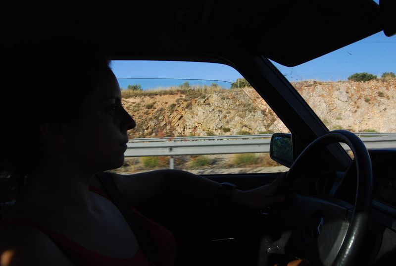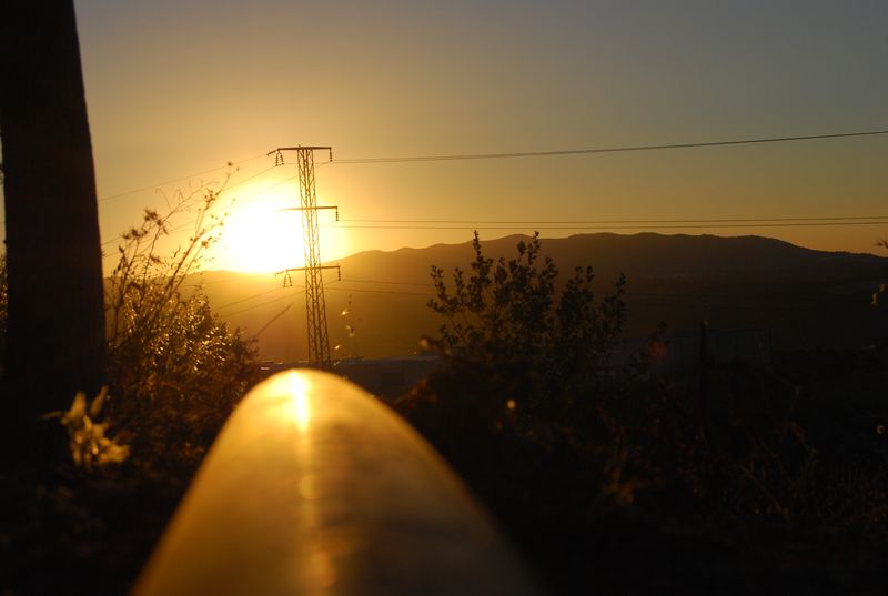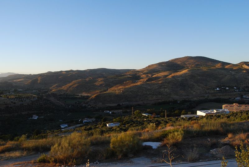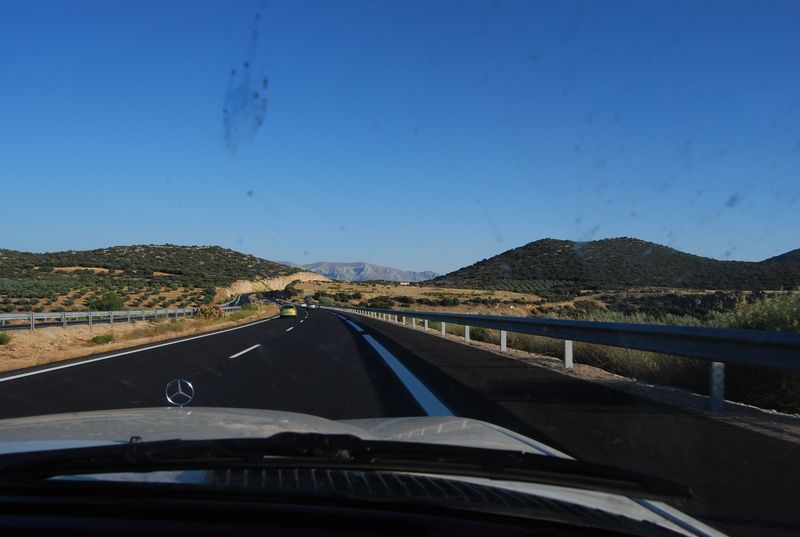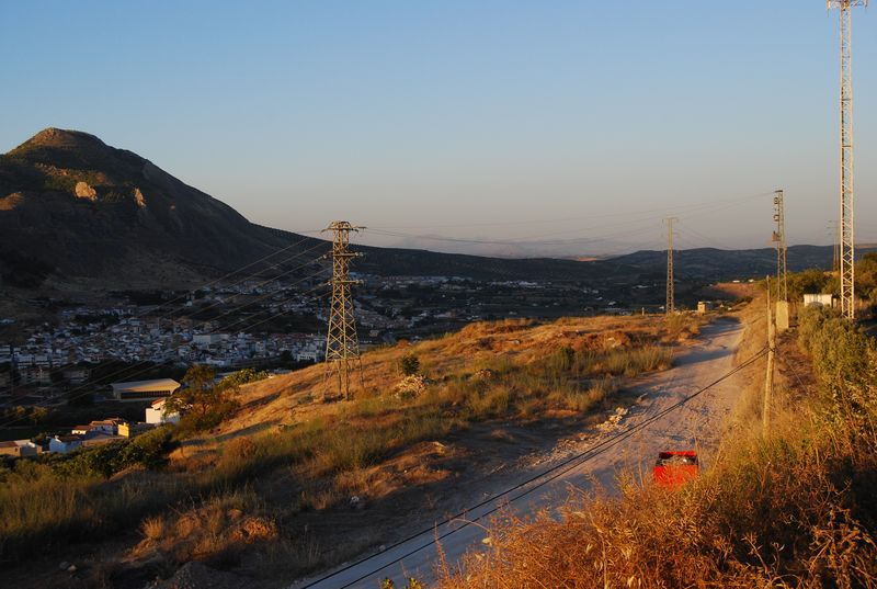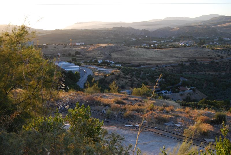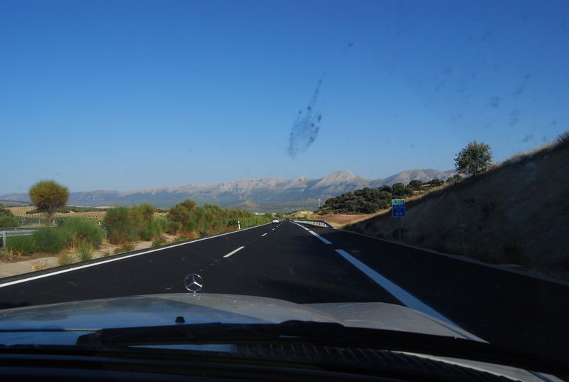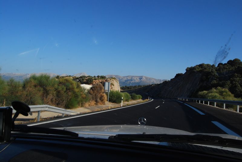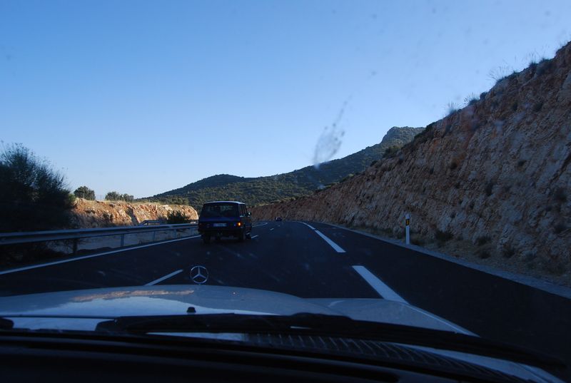 Hinter Madrid mußte bei km 325.955 wieder getankt werden. Der nun volle Tank sollte meinen Berechnungen nach bis Tarifa reichen, wir wollten natürlich nicht mit vollem Tank in Ceuta und Marokko ankommen. Katha übernahm das Steuer und wechselte sich etwas später mit Francis ab, während ich auf dem Beifahrersitz sinnlos herumsaß und meine Zeit mit photographieren und filmen verbrachte. Über Jaen und Granada (A4 und A44) erreichten wir Malaga. Ich übernahm das Steuer wieder und machte mich auf, den Rest bis Tarifa selbst zu fahren. Auf den letzten 50 Kilometern vor Malaga fährt man auf der A45 von der Hochebene auf Meereshöhe herunter. Diese Strecke fand ich atemberaubend, hinzu kam der hier gegenwärtige Sonnenuntergang.