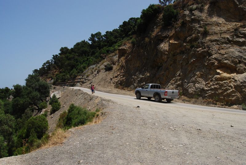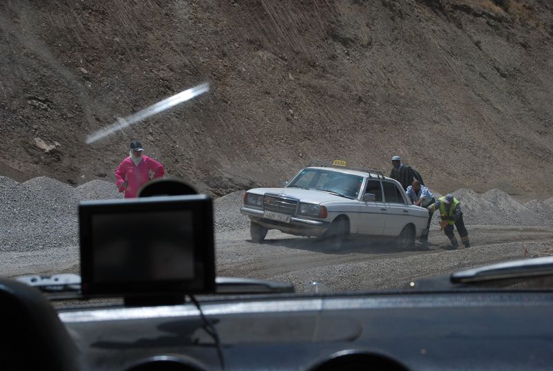 anhalten, weil ein steiles Stück Schotterstraße, das wir zum Glück nur
