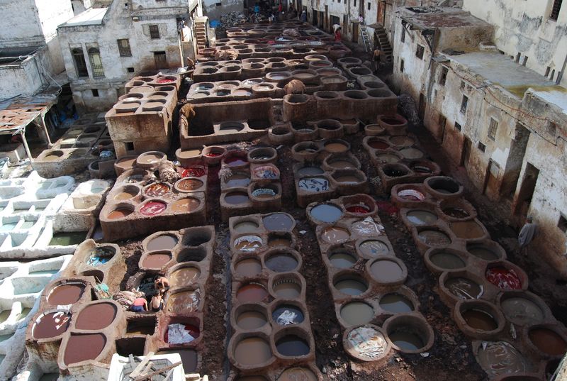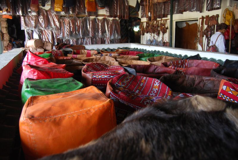 Wieder im Tal führte Ali uns auf einen bewachten Parkplatz und hinein in die Medina. Ohne ihn hätten wir wahrscheinlich nicht mehr zurückgefunden. Erste Station der nun folgenden unfreiwilligigen und für Unmut sorgenden Shoppingtour war die Gerberei. Dort empfing uns ein eifriger englischsprechender Verkäufer, der uns zunächst auf den Balkon mit Blick auf die Gerberei und Färberei führte. Den wirklich unglaublich abartigen Gestank konnten wir nur mit dem Pfefferminz, den er uns vorher gab, einigermaßen abmildern, doch war dies trotzdem der ekelhafteste Geruch den ich je wahrnahm. Gleichzeitig sah man unten die Kinder auf den Kübeln hocken, während links und rechts die Tierhäute verwesten. Na Prost Mahlzeit!