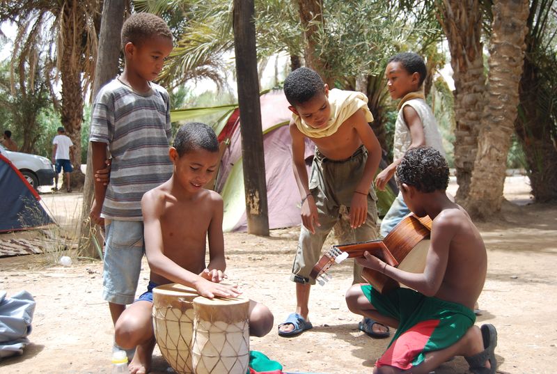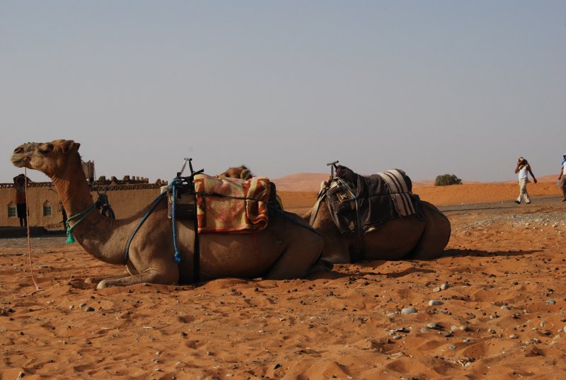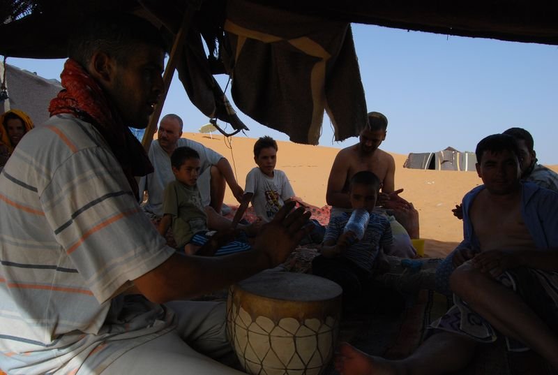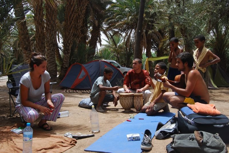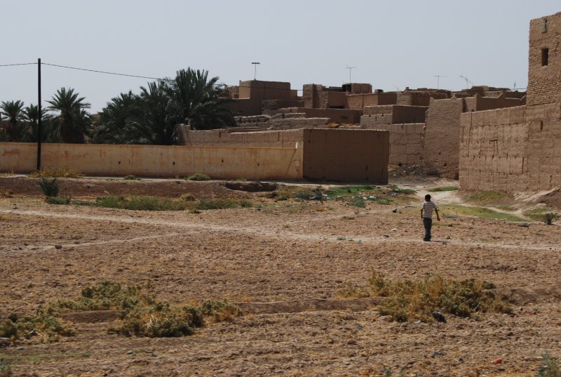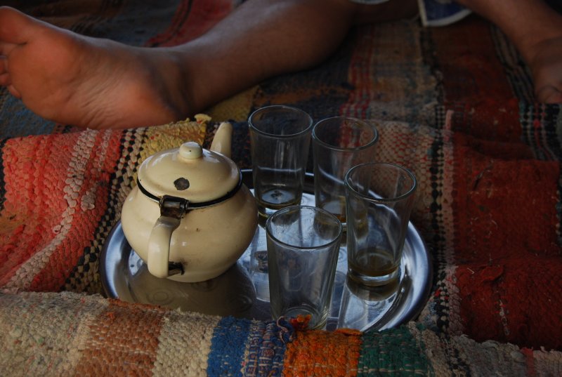 Auch der Säufer von gestern abend war wieder wach, paßte mich ab und lud mich kurzerhand zu einem Tee ein. Seine Frau sah eher europäisch als afrikanisch aus und er erzählte mir, daß sie mal einige Jahre in Deutschland gelebt hätte. Aber Deutsch sprach sie nicht. Auch seine drei kleinen Kinder kullerten in der Ecke, die sie sich eingerichtet hatten, herum und sahen mich mit ihren großen Augen ziemlich ungläubig an. Der Säufer hatte sich mit seiner Frau hier häuslich eingerichtet und wohnte wohl mit seiner Frau und den Kindern zumindest im Sommer im Zelt wie es schien. Er erzählte, er hätte ein Büro in Errachidia und müßte später dort hin.