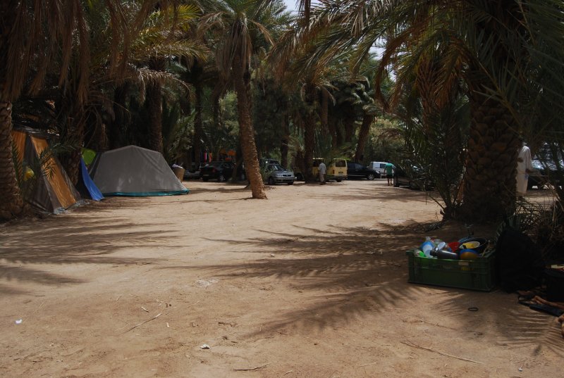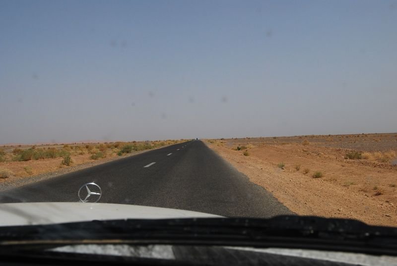 Währenddessen schnallte ich das Gepäck auf den Träger. Es war so heiß, daß mir die Metallstangen die Beinhaare ansengten. Der Schweiß tropfte. Mittlerweile waren schätzungsweise 20 Berberkinder am Auto versammelt, die Geschenke haben wollten und ständig, wie Toufik Tags zuvor, Kamele aus den herumliegenden Palmenblättern flechteten. Wir wiesen ihr Anliegen zurück, doch sie wichen nicht vom Platz. Toufik bat bei Abfahrt um eine kleine Entlohnung für seine Dienste, er fragte, ob wir Euros für ihn hätten. Ja sicher doch, ich schüttete ihm den Aschenbecher des Daimlers in seine Hände aus, dort hatte ich in den letzten Monaten mehrere Euro an Münzgeld gesammelt. Das reichte ihm nicht, doch seine Forderung nach mehr Geld überhörte ich geflissentlich. Er akzeptierte das wohl, doch bat noch um eine Flasche Wein, „für Papa“. Soviel dann auch zum Ramadan. Das frechste und dickste der kleinen mittlerweile sehr aufdringlich gewordenden Berberkinder schubste ich mit der Stoßstange weg, dann fuhren wir zur Ausfahrt des Campingplatzes und zahlten unsere 60 Dirham für die Übernachtung. Beslama!