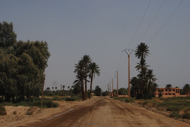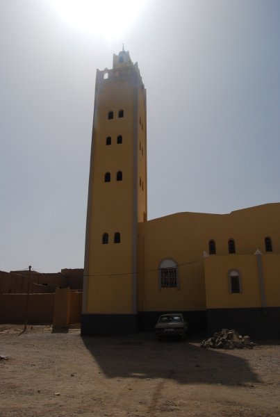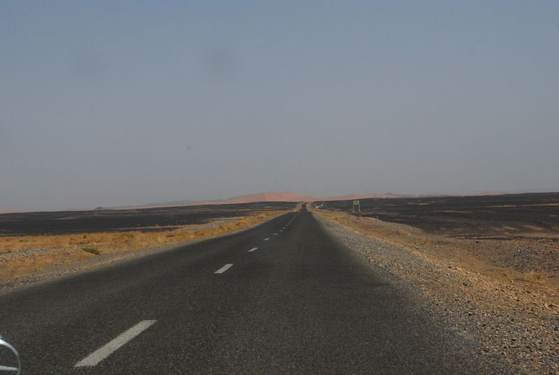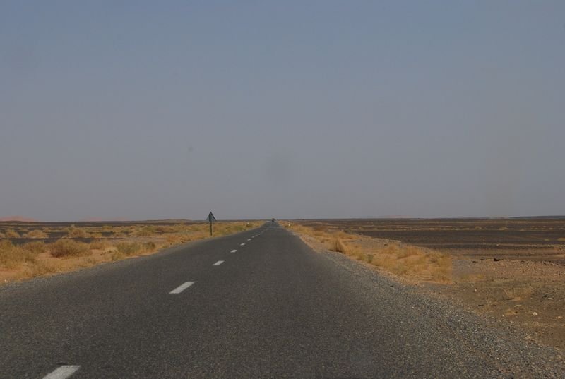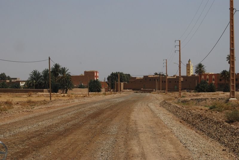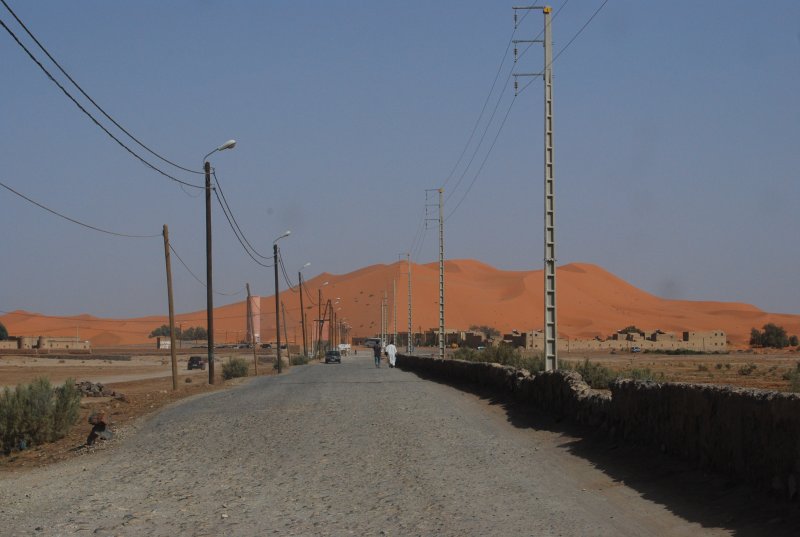 Nächstes Ziel war Merzouga, direkt bei den Dünen von Erg Chebbi. Ereignislose Fahrt dorthin. An einer Gabelung fuhr ich falsch ab und folgte einem Schild mit der Aufschrift „route touristique“. Sie führte über einen Rundkurs mit geschotterten Straßen durch verlassene Ksar-Dörfer. Kein Verkehr, kaum Menschen. Unheimliche Stimmung machte sich breit. Zurück an der Hauptstraße sind wir dann weiter in die richtige Richtung gefahren.