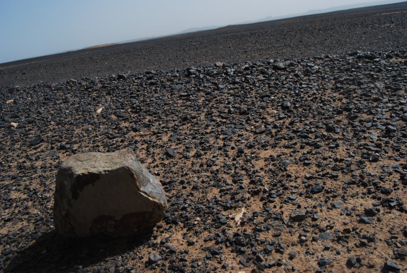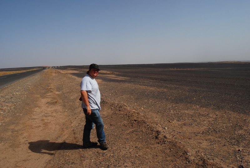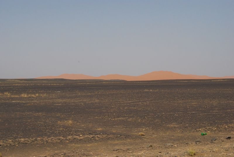 Die Landschaft wurde immer karger, schließlich waren am Horizont die roten Sandhaufen zu sehen. An der letzten Kreuzung vor Merzouga hielten wir um einen Blick in die Karte zu werfen. Ein Heimischer hielt neben uns und quatschte uns voll. Er erzählte von einer schauerlichen Piste zu den Dünen, die wir ohne seine Hilfe nicht bestreiten könnten. Er würde uns für einen „small price“ einen „little boy“ zur Verfügung stellen, der uns lotsen würde. Sonst ist aber alles klar? Wir fuhren weiter und erreichten Merzouga nach einem Photostopp in der Gesteinswüste bei 50 °C plus x – höhere Werte zeigt das Thermometer aus Geiranger nicht an.