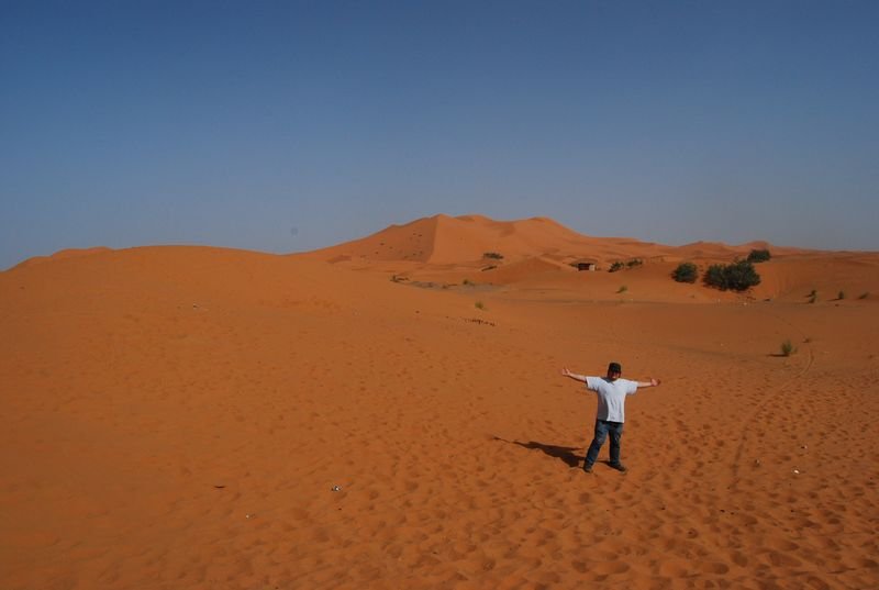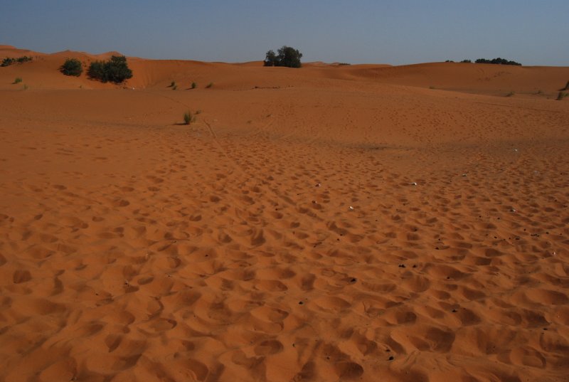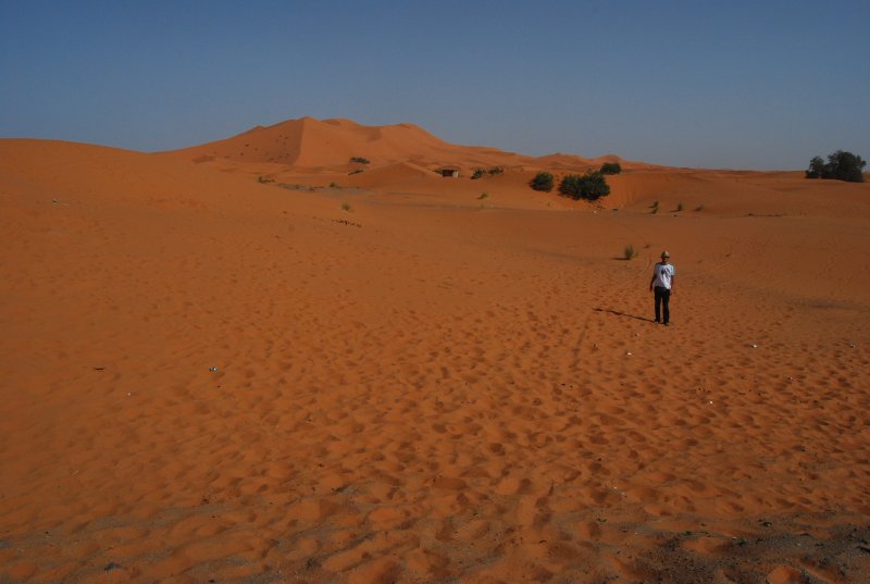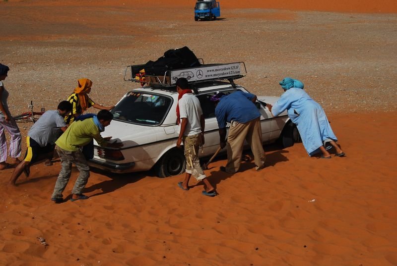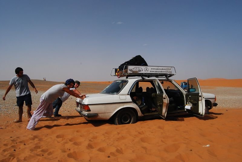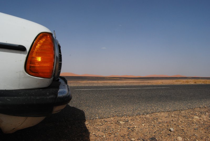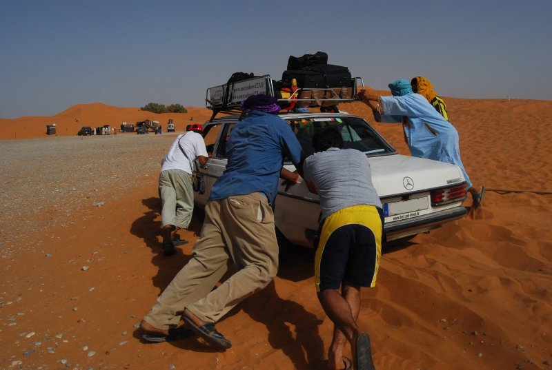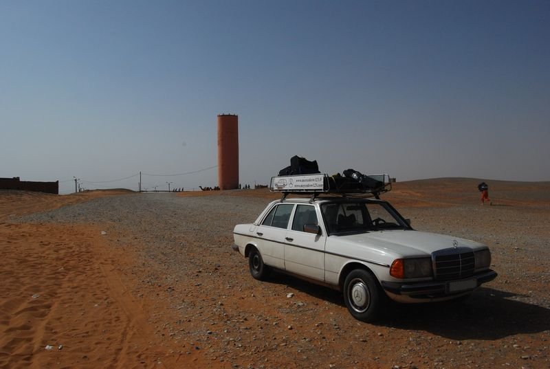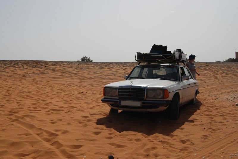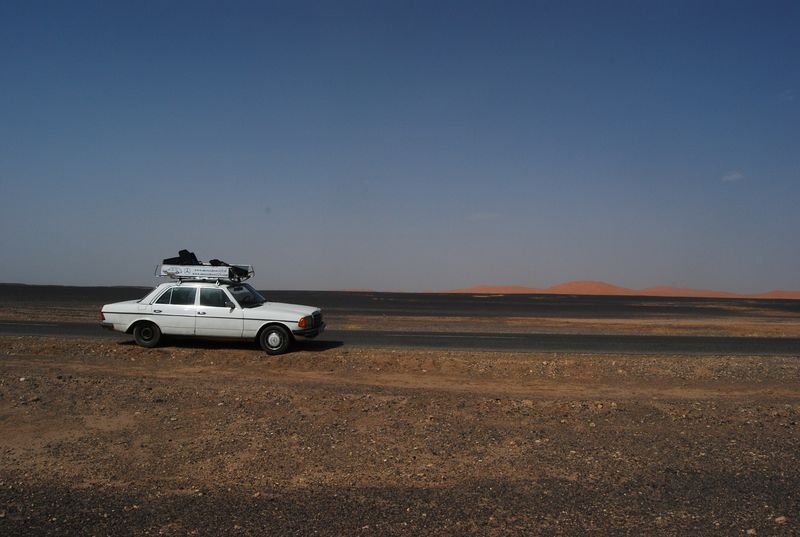 Wenn man geradeaus durch den Ort fährt erreicht man eine kurze ungefährliche Steinpiste, hinter der ein kleiner Turm zu sehen ist. Dort steht man direkt an den Sanddünen. Ein paar Fakeberber stehen herum und warten auf Leute, die von hier mit einem ihrer Kamele in die Dünen reiten wollten. Wir wollten nicht. Das einzige wirkliche Kamel bei uns, nämlich ich, saß am Steuer des Wagens und mußte nun unbedingt damit anfangen, mit einem 200D im Sand zu spielen. Natürlich ging das nach einigen Momenten schief und da standen wir. Die Berber kamen mit Schippen angerannt und schaufelten und schoben den Daimler heraus. Wahrscheinlich war das der zweite Betriebszweck ihrer Unternehmung, denn anschließend verlangten sie brav ihre Dirhams. Ich kramte mein loses Kleingeld aus der Tasche und bedankte mich.