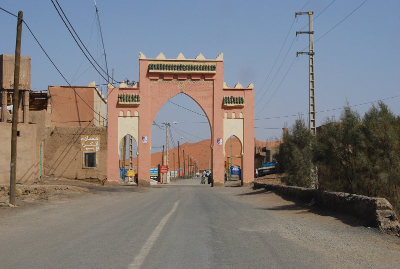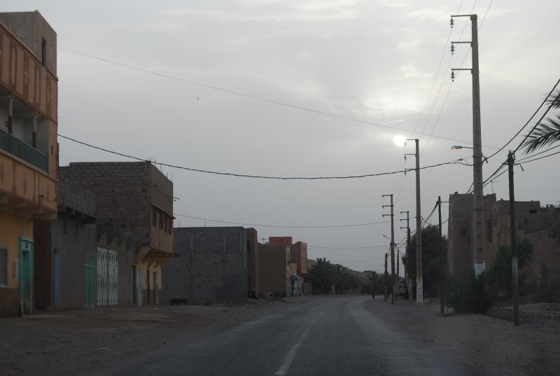 In Erfoud tankten wir noch einmal voll (km 327.832) und nahmen die Querverbindung R702 über Tinejdad nach Tinerhir. Die Landschaft bleibt hier staubig-karg. Während der Durchfahrt eines der unzähligen halb oder ganz verlassenen Dörfern auf dieser Strecke ging die Sonne unter. Hier merkte ich, wie hilfreich die weißen reflektierenden Straßenbegrenzer in Europa bei der Nachtfahrt doch sein können. Hier verlangte es deutlich mehr Können ab, gerade bei blendendem Gegenverkehr und sandverschwommenen Straßenrändern.