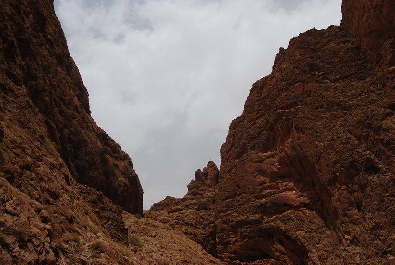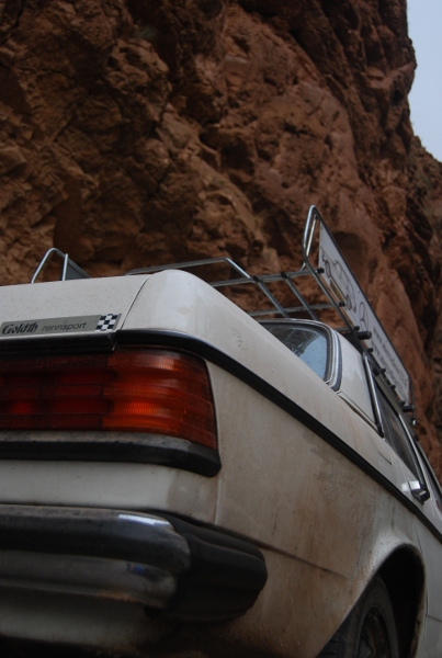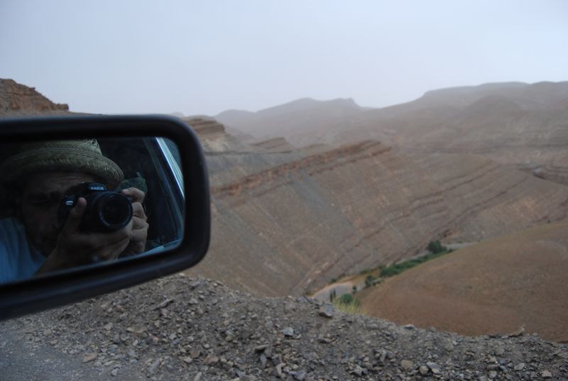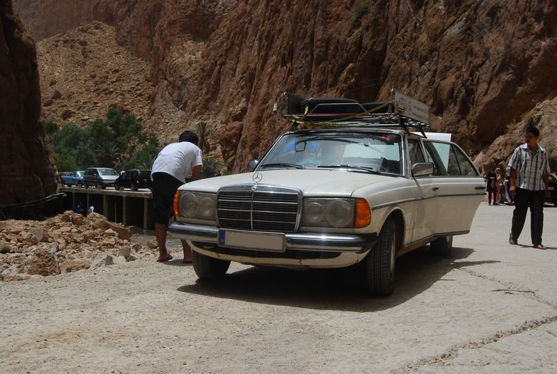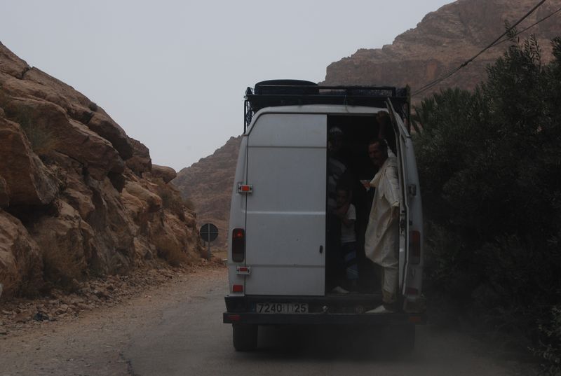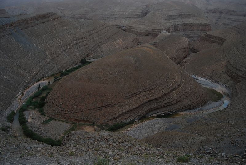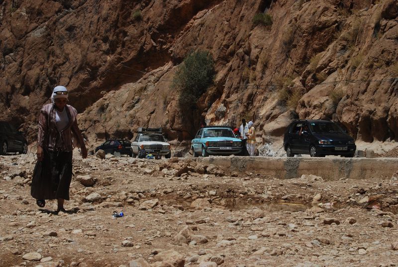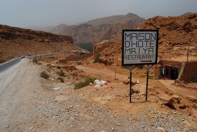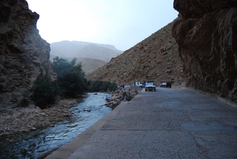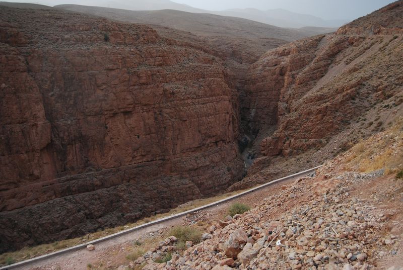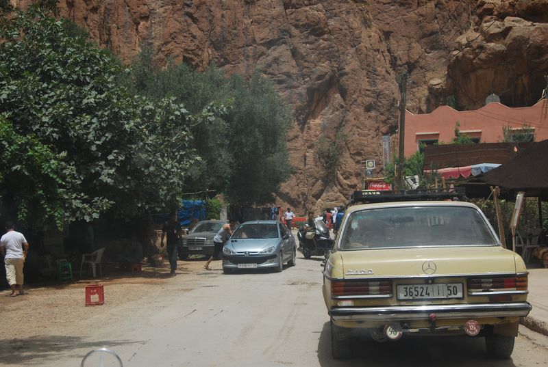 Ohne es zu merken fuhr ich die berühmten Serpentinen hoch, das Café ließen wir zunächst links liegen. Wir kamen an einer Engstelle vorbei, wo bei Hochwasser kein Durchkommen mehr ist, das hatte ich schon mehrfach vorher auf Videos gesehen. Der Pegel war heute aber auf Normalstand. Ein paar Kilometer weiter waren wir alleine auf weiter Flur. Die Standardtouristen fahren wohl nicht weiter als bis zu den Serpentinen. Wir sahen die beeindruckenden Canyons, die der Fluß gegraben hat. Die Piste wurde einspurig. Mit Gegenverkehr wär’s spannend geworden, doch konnten wir hier einfach mal eine Viertelstunde anhalten und die Landschaft atmen. Wir kamen noch durch Msemrir, ein kleines Dorf am Ende der Strecke. Die Leute hier sahen aus, als seien sie noch nie aus der Schlucht herausgekommen. Bedrückend und faszinierend. So stellt man sich ein einsames Bergdorf vor. Es muß ein besonderes Leben sein, hier im Gebirge. Vermutlich wohnen hier Schäfer und Bauern, die mit dem leben müssen, was da ist. Wie es hier wohl im Winter ist?