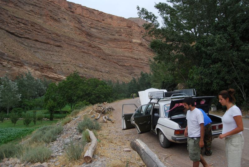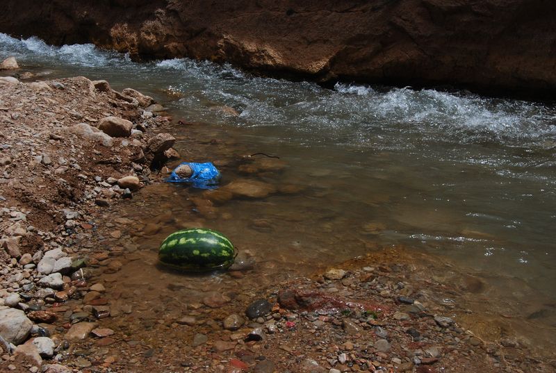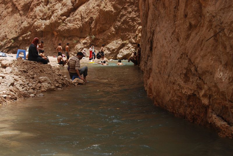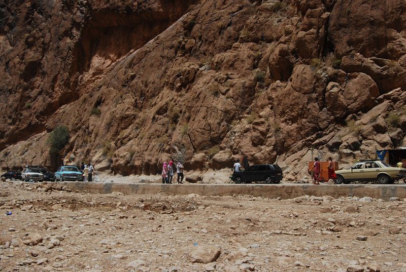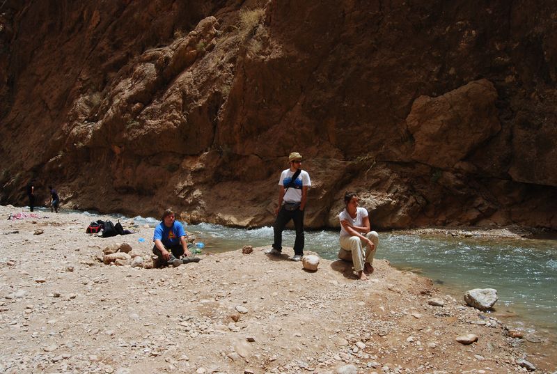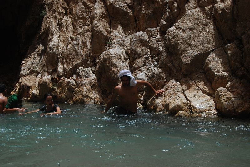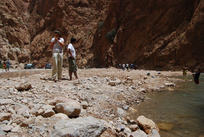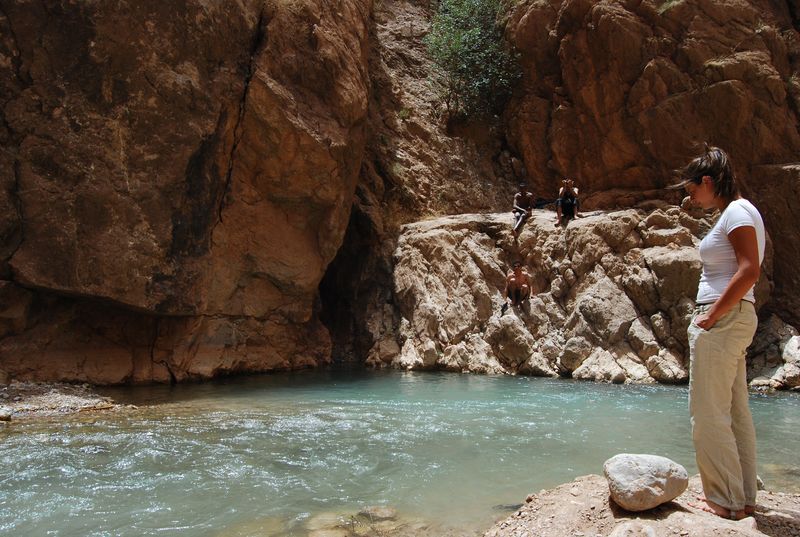 Ein paar Kilometer weiter gab’s eine Rast an einer Flußbiegung. Hier war ein stattliches Treiben von Touristen und Marokkanern zu beobachten, viele kühlten sich im Wasser ab. Wir hatten leider keine Badesachen dabei, daher konnten wir uns nicht in dem Quellwasser erfrischen. Francis hüpfte einfach in voller Montur hinein und kletterte auf einen Felsen, wo er sich mit ein paar jungen Franzosen unterhielt.