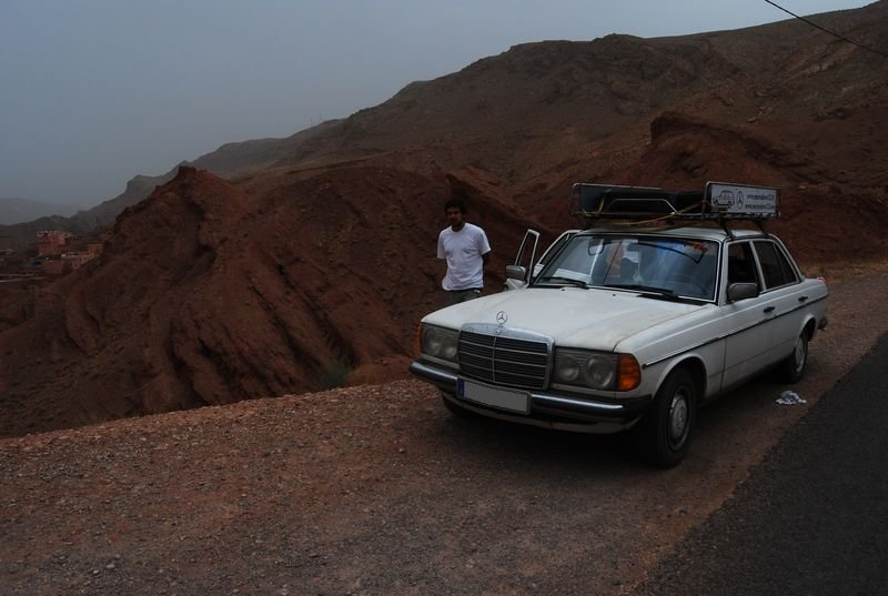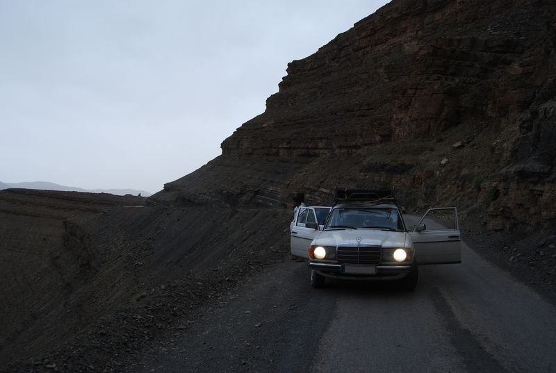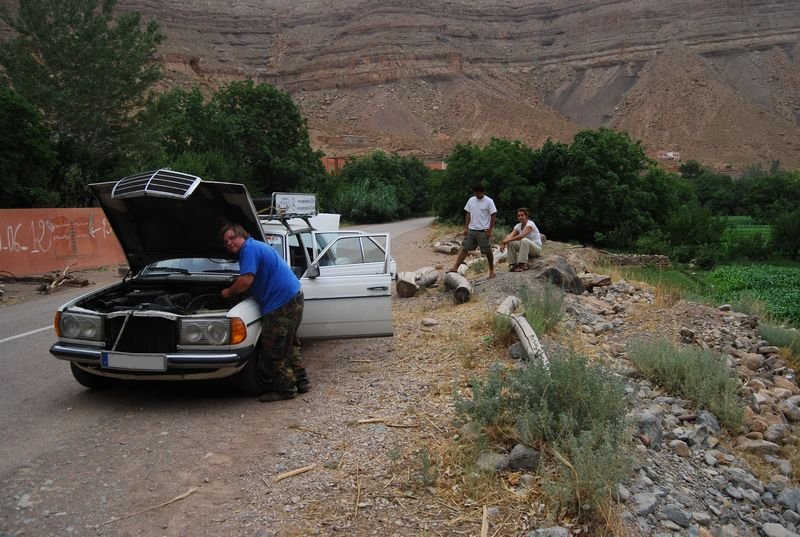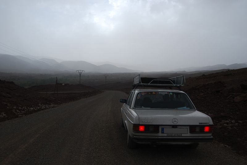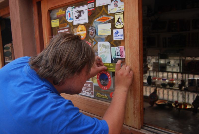 Wir fuhren zurück, durch bis zum Café an den Serpentinen. Dort unterhielt ich mich kurz mit dem Besitzer, kaufte ihm einen Marokkosticker ab und klebte einen Goldthsticker an seine Fensterscheibe, direkt neben einen Dust-and-Diesel-Aufkleber. Paßt!