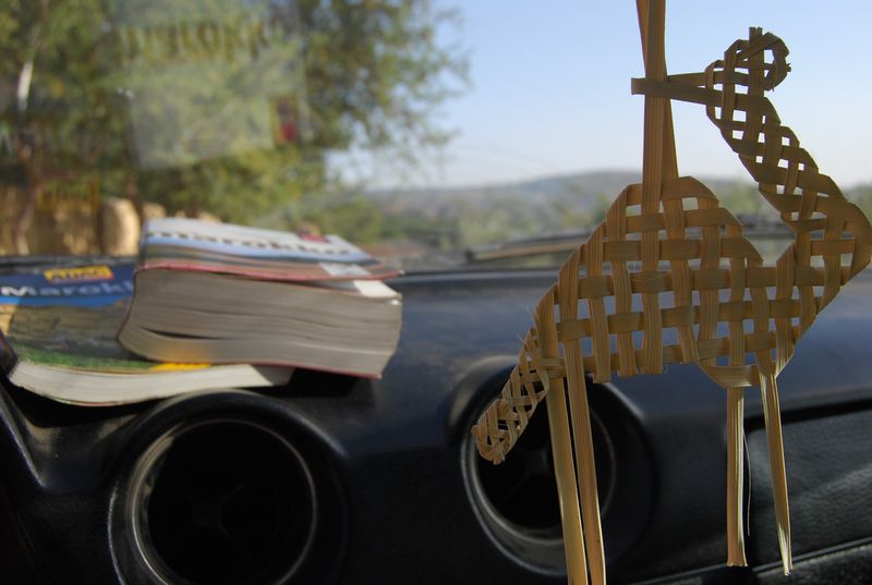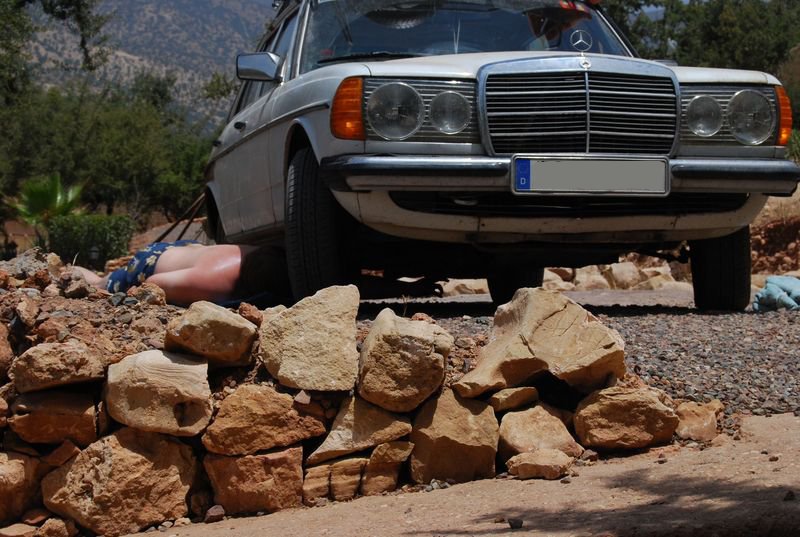Hier führe ich gerade einen kleinen Service am Auspuff durch und prüfe die Haltbarkeit. Seit dem Defekt in Marrakech war die Halterung des Auspuffs am Getriebe abgebrochen, sie war schon seit dem Kauf rostig. Naja, wird schon halten, ist ja ein Mercedes.