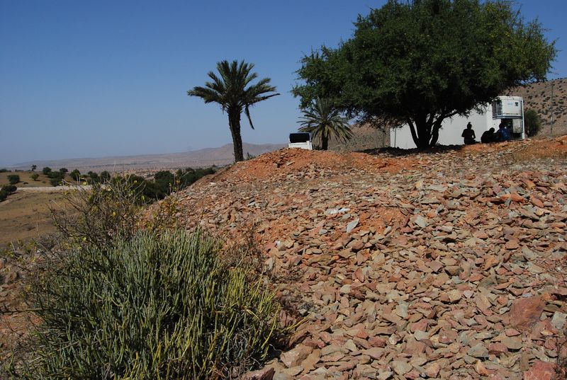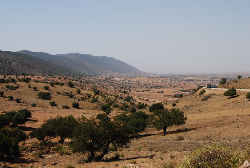Hier, kurz hinter Tiznit, erklimmt man noch einmal einen kleinen Ausläufer des Atlas mit knapp 1000 Metern Höhe über Meer. Anschließend geht es in die Ebene herab, wo das Grün schnell weniger wird und schließlich komplett zugunsten des Sandes verschwindet.