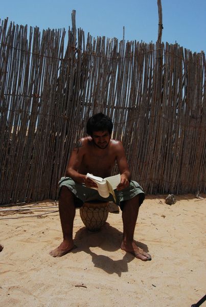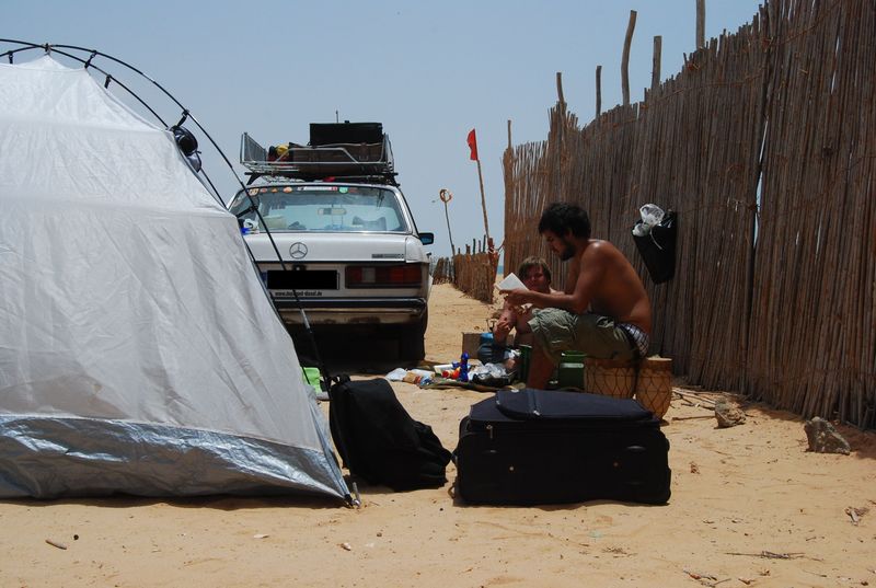 Der Platzwart, ein Mitte-30-jähriger dauerbreiter Marokkaner mit roten Augen und grauen Zähnen, Patrick hieß er, empfing uns und zeigte uns einen windgeschützten Platz ganz hinten rechts. Wir richteten uns ein und legten uns erst einmal an unseren „privaten“ Strand, an dem nur selten andere Leute rumlagen oder –schwammen. Abgesehen von einer handvoll Surfern, die hin und wieder einmal umherliefen, waren wir mit Patrick alleine auf dem Campingplatz.