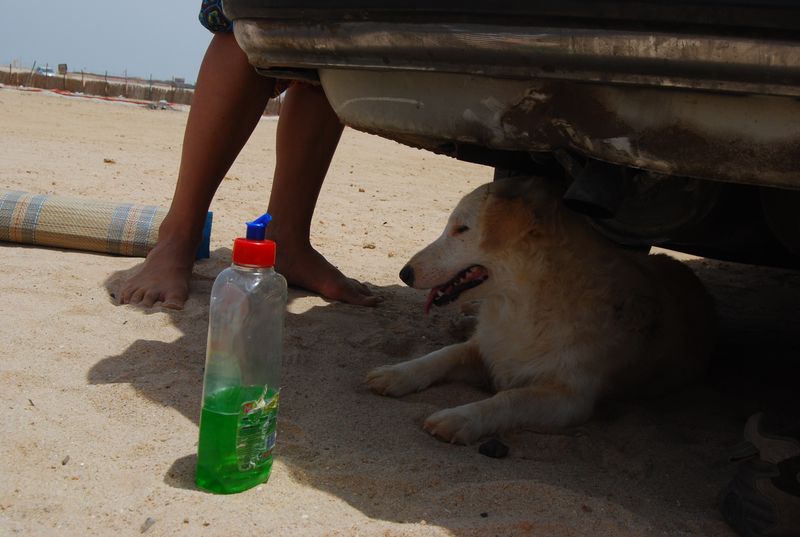 Auf dem Weg lag ein kleiner abgezäunter Wald, durch den wir fuhren und dessen Sinn keinem einleuchten wollte. Dort lag der Campingplatz nicht, aber wenige Meter dahinter sahen wir die Einfahrt und ein Schild mit der Aufschrift „SURF EX DAK“. Er wurde wohl umbenannt. Dennoch müssen die Soldaten aus der Kaserne eine nicht mehr meßbare Aufmerksamkeitsspanne haben, wenn sie nicht wissen, daß 700 Meter neben ihnen ein Campingplatz liegt. Oder es war Absicht. Das sind so Sachen die man in Marokko erlebt und die man nie ganz auflösen kann.