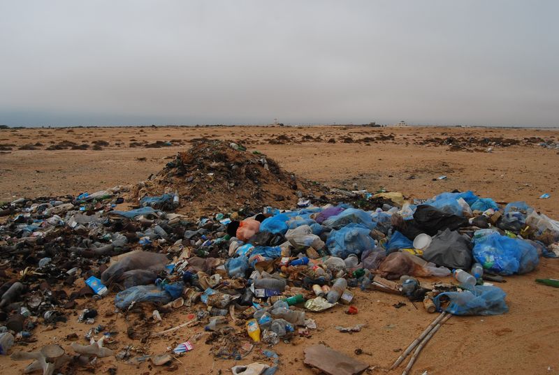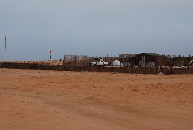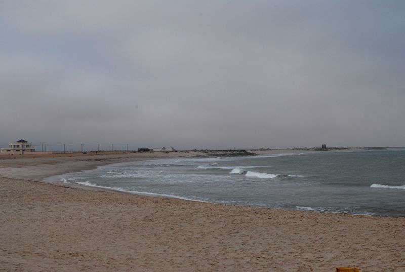 Wir liefen dort hin und betraten den Shop, wo ich den Aufkleber nach kurzer Preisverhandlung kaufte. Der Verkäufer verwechselte mehr oder weniger Absichtlich Dirham und Euro und wollte erst 20 EUR statt 20 MAD für den Aufkleber haben, wohl in der Hoffnung, daß ich so wohlhabend sein würde und den Preis bezahlte. Das „Mißverständnis“ klärte sich dann aber recht schnell. Wir liefen Richtung Stadtzentrum zurück und unser neuer Freund erzählte, er käme aus Agadir und sei der Arbeit wegen nach Dakhla gekommen. Er arbeite im Sahara Regency, dem besten Hotel Dakhlas (5 Sterne). Er zeigte uns auch noch eine skurille versteckte Kneipe. Hier stand in einem kleinen Hinterhofkabuff ein einsamer Barkeeper herum und wusch seine Gläser. Ein Schild, das von außen auf diese Lokalität hinwies, gab es nicht. Wir fragten nach günstigem Bier zum Mitnehmen, doch unter ugf. 25 EUR pro Palette wollte er nicht mal das Stork-Dosenbier herausrücken. Schade. Abends kehren hier wohl die aus dem Norden des Landes für den Ausbau dieser ständig expandierenden Stadt rekrutierten Soldaten, Polizisten und Arbeiter ein und spülen mit dem teuren Bier ihren Arbeitstag herunter, auf daß Allah nicht hinsieht. Unser „Guide“ schien ganz gut situiert zu sein, denn selbst auf mein Drängen hin wollte er nicht einmal eine kühle Cola aus dem Kiosk als Dank für seine Hilfe annehmen. Wir bedankten uns recht herzlich und Francis und ich fuhren Richtung Camping zurück.