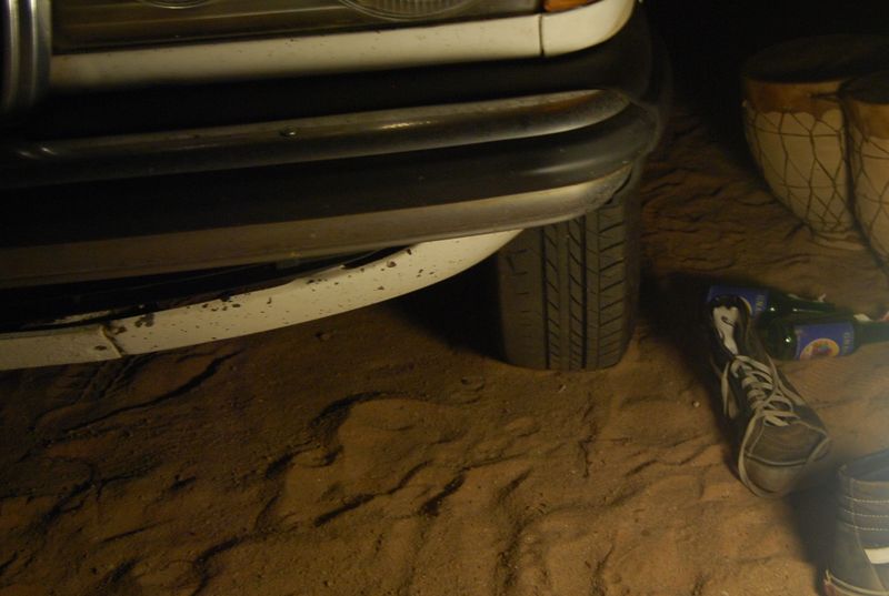 Rechts neben dem Reifen die zwei Flaschen Anisschnaps vom Säufer aus Meski, die