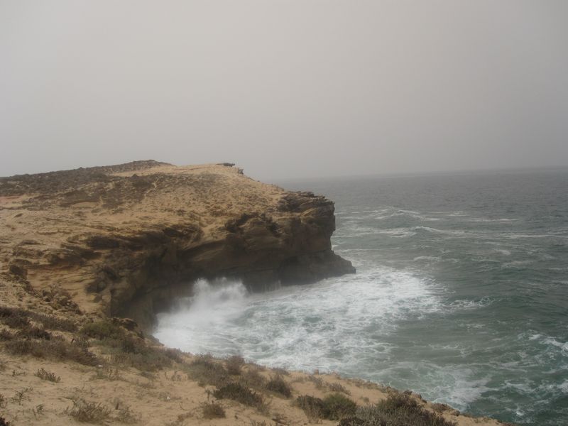 Gen Norden ging es aus Agadir heraus, die Küstenstraße entlang die mit ein paar Serpentinen und vielen schönen Ausblicken sehr gefiel. Als es sich anbot, hielten wir kurz für eine Zigaretten- und zweite Frühstückspause. Unten sahen wir die Wellen mit voller Wucht gegen die Steilküste peitschen.