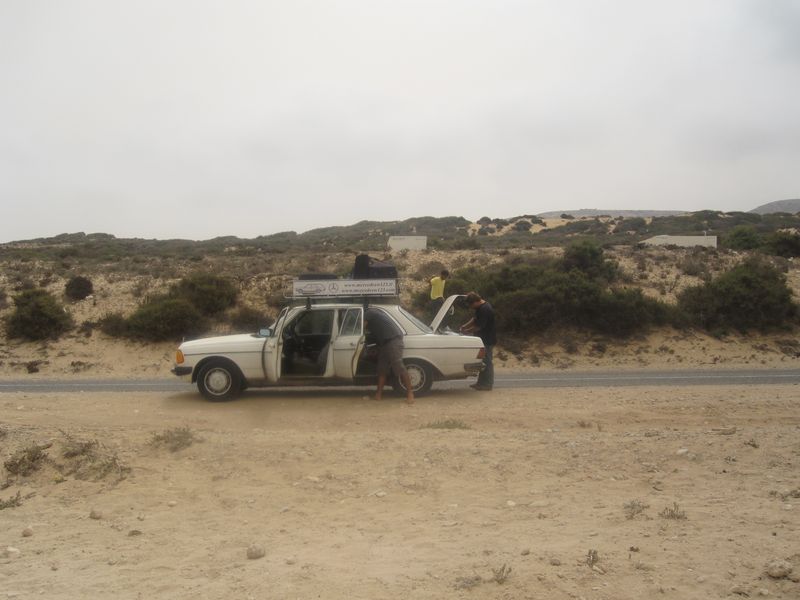 Wir erhoben uns nacheinander gegen 8.30 Uhr und sahen lauter staunende Marokkaner um uns herumwuseln, die uns womöglich für verrückt erklärt hatten. Vier Weiße, die in einem Taxi schlafen ... Immerhin waren unsere Schuhe, die wir unter das Auto gestellt hatten, allesamt noch da. Um 9 Uhr waren wir im Marjane eingetroffen, deckten uns ein und aßen uns am Paninistand ein Frühstück, genau wie vor 7 Tagen, als wäre in der Zwischenzeit nichts passiert.