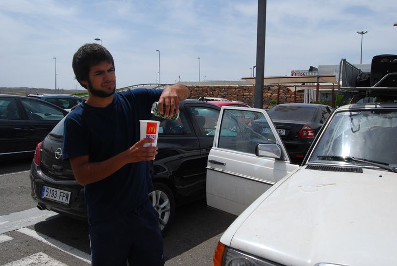 Frisch gestärkt und sauber fuhren wir auf der Autopista bis Zaragoza, wo das Hungergefühl bei McDonald's gestillt wurde. Auf dem Gelände, dem „Diagonal Plaza“, befand sich die Firma „Autoplaza“, der spanische Klon von ATU. Ich sah den Reifen vorne links an, der in Boujdour auf der Felge gedreht wurde und stellte fest, daß er kein Profil mehr besaß. Vorne rechts war der Reifen innen blank und außen noch mit ausreichend Profil gesegnet. Also bei der Werkstatt vorgefahren, wo wir die einzigen Kunden waren. Francis brachte dem Meister mein Anliegen bei: Er sollte den Reifen vorne links mit dem aus der Reserveradmulde wechseln und den Reifen vorne rechts auf der Felge umdrehen. Er erklärte mich in einem Anfall industriestaatlicher Pedanterie für verrückt und sagte, man könne den Reifen nicht einfach umdrehen, weil er laufrichtungsgebunden sei. Als wenn mich das interessiert hätte. Ich wollte damit nur noch nach Deutschland zurück kommen - dort hatte ich richtige Reifen im Keller, um die es schade wäre. Hier aber handelte es sich um einen schäbigen Fulda Diadem von 1998. Solange das Rad keine Unwucht hat, ist doch alles in Ordnung ...