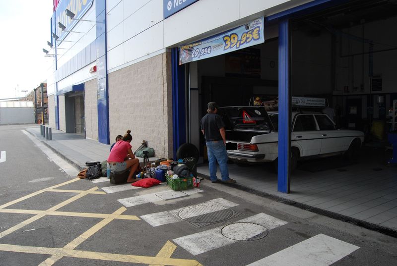 Er erklärte sich bereit auf meine Verantwortung hin die „Reparatur“ durchzuführen und setzte sich in den Wagen, um ihn zur Hebebühne zu fahren. Als wenn es sich um einen Neuwagen handelte zog er dem Fahrersitz noch einen Schonbezug auf, bevor er einstieg. Während der Arbeiten sprach er mit uns und seinen Gesellen darüber wie verrückt wir seien mit dem alten Benz nach Marokko zu fahren und die ganzen alten Reifen zu verheizen. Aber was soll's, es ist staubtrocken gewesen und hat ungefähr drei mal kurz geregnet in den letzten vier Wochen, da sind Slicks ja bekanntlich am sichersten.