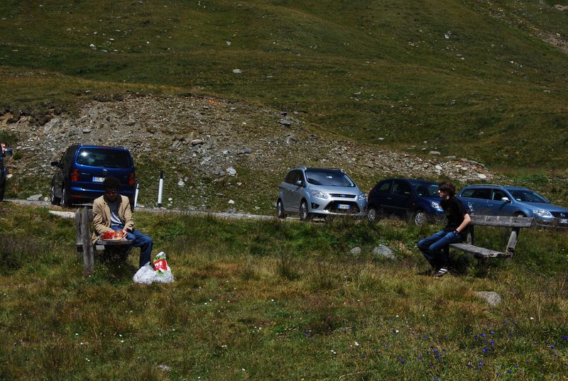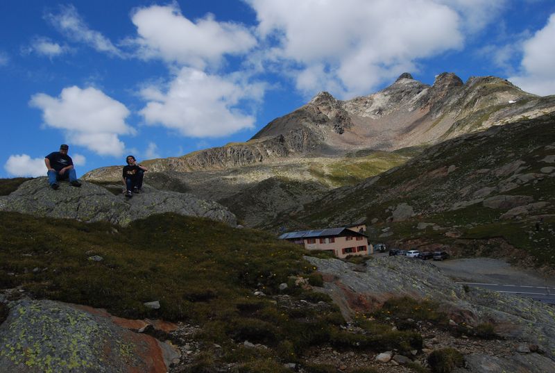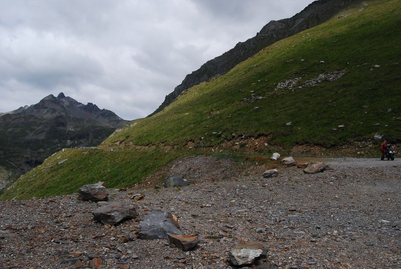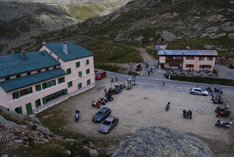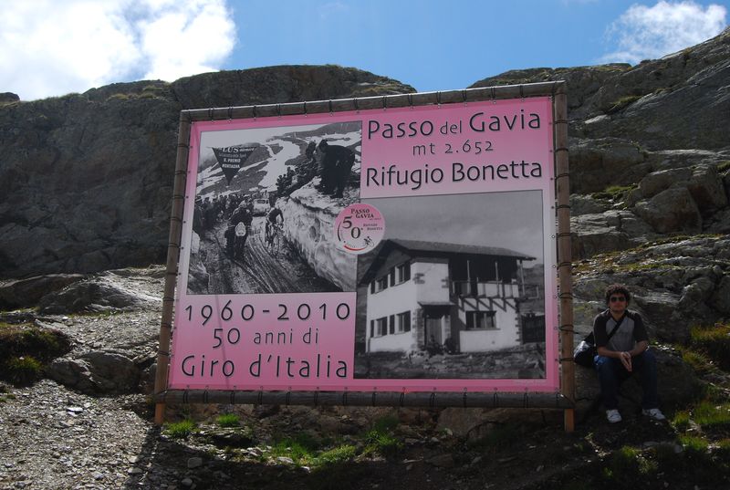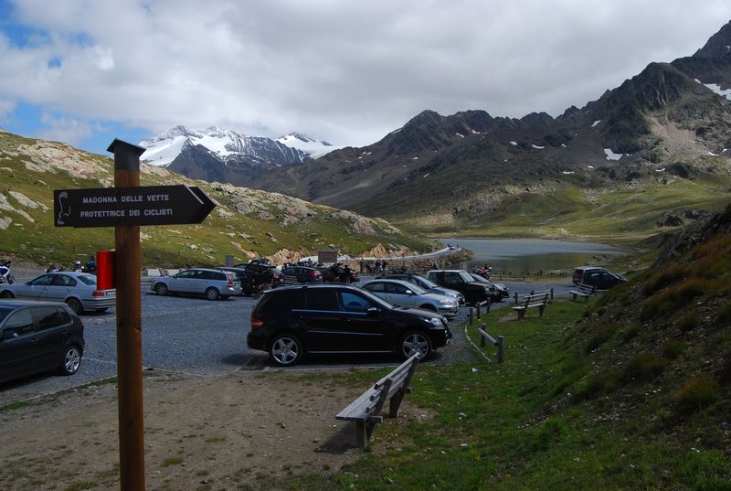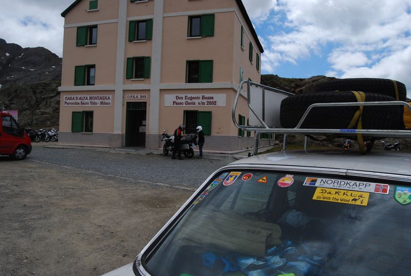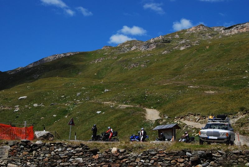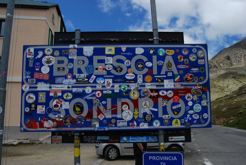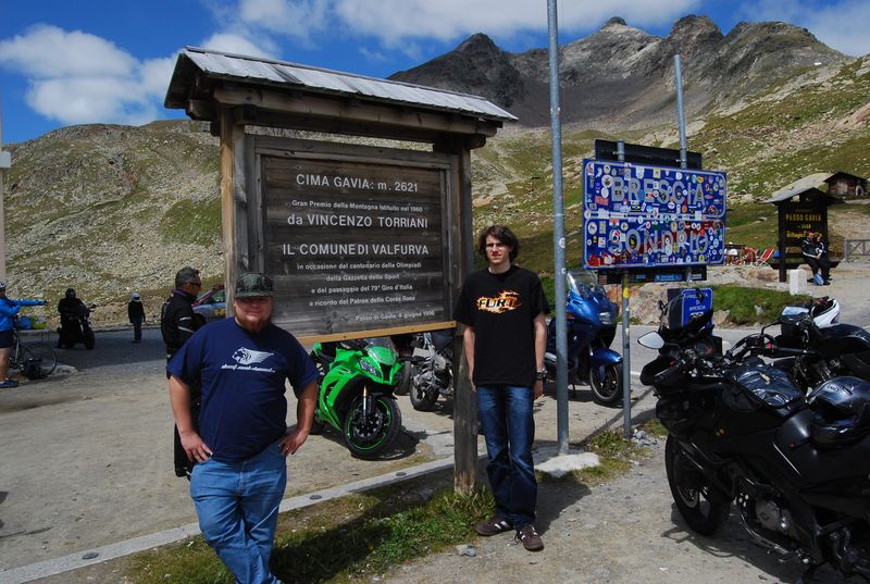 Gegen 10 Uhr kamen wir weiter und fuhren wieder bis nach Bormio, weil wir nun auf den Gaviapaß hinauf wollten. Den konnte ich ja 2009 nicht befahren, weil mir wegen des defekten Elektrolüfters an der Südseite der Kühler überhitzt war. Nun sollte der Paß aber fallen! Schon der Aufstieg bot einige Stellen auf, an der keine zwei Autos nebeneinander vorbeipaßten. Hin und wieder gab es dann Ausweichstellen und man mußte sich dann einig werden. Während des Anstiegs hielten wir für eine kurze Frühstücksbrotzeit. Auf der Paßhöhe wurden einige Photos gemacht und wir bestiegen eine kleine Anhöhe, von der wir die Südseite hinabsehen konnten. Es sah aus, als würde der Berg einfach abbrechen und man könnte in eine riesige Schlucht stürzen, so stark ging es bergab. Die Straße konnte man von hier gar nicht sehen.