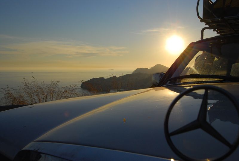 Wir gaben weit nach Mitternacht die Suche auf und ergaben uns unserem Schicksal. Ich fuhr in Richtung Osten an der Bucht entlang aus Kotor heraus und wir stellten uns für ein paar Stunden auf eine geschotterte Abbiegung von der Landstraße und schliefen zu dritt im Auto, nachdem wir auch im Apartment in diesem etwas abgelegenen Orte abgewiesen wurden. Die Gepäckstücke auf die Hutablage und in die Fußräume gequetscht paßte auch einer längs auf die Rückbank, die anderen beiden lagen auf den Vordersitzen.