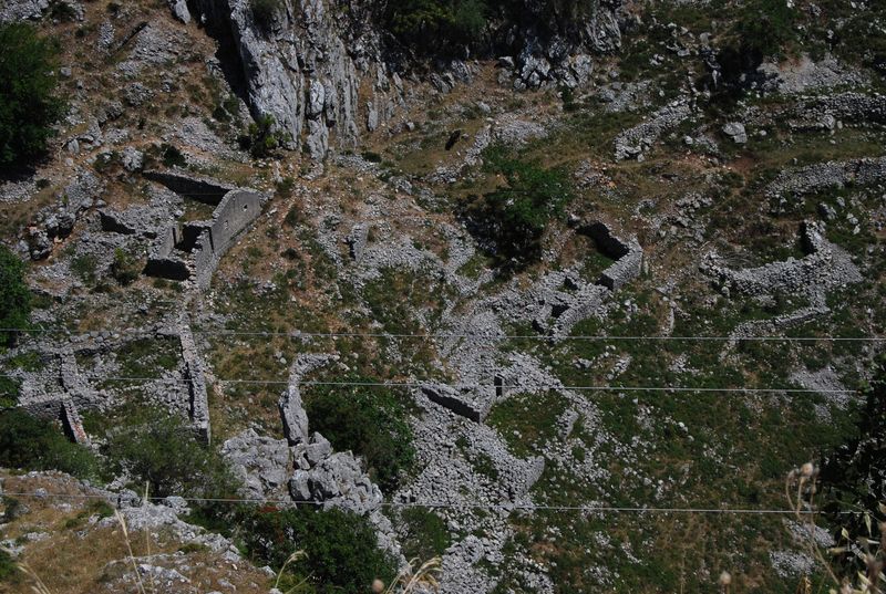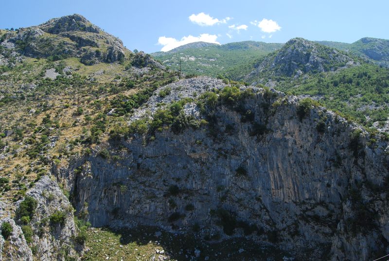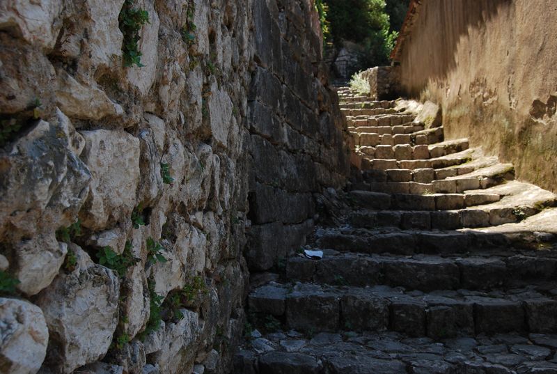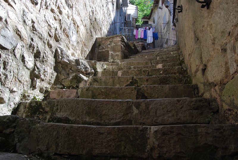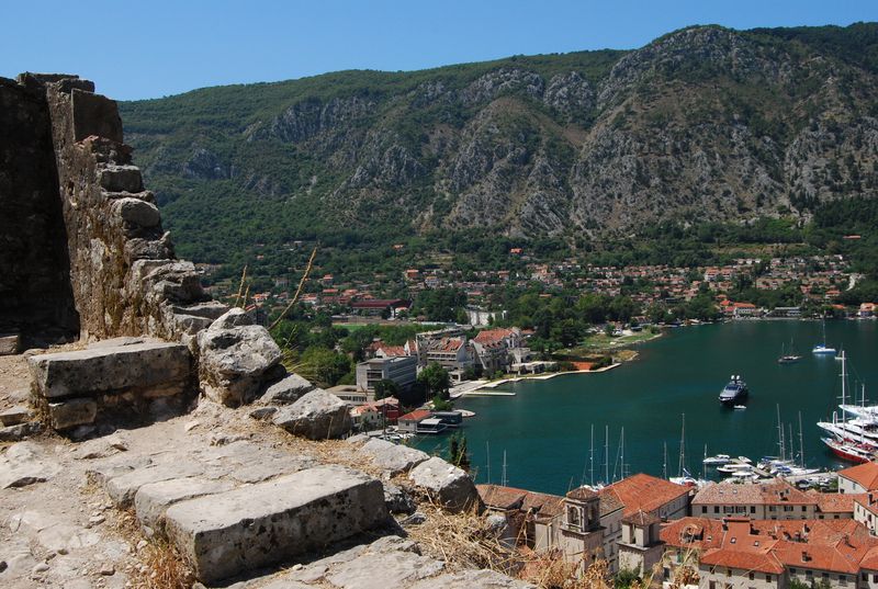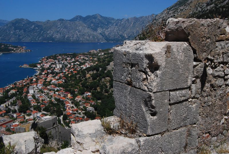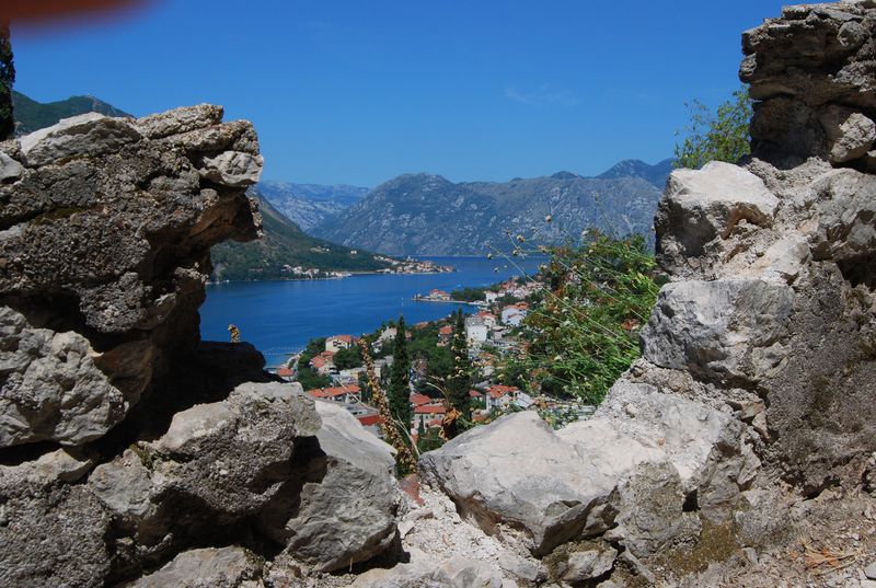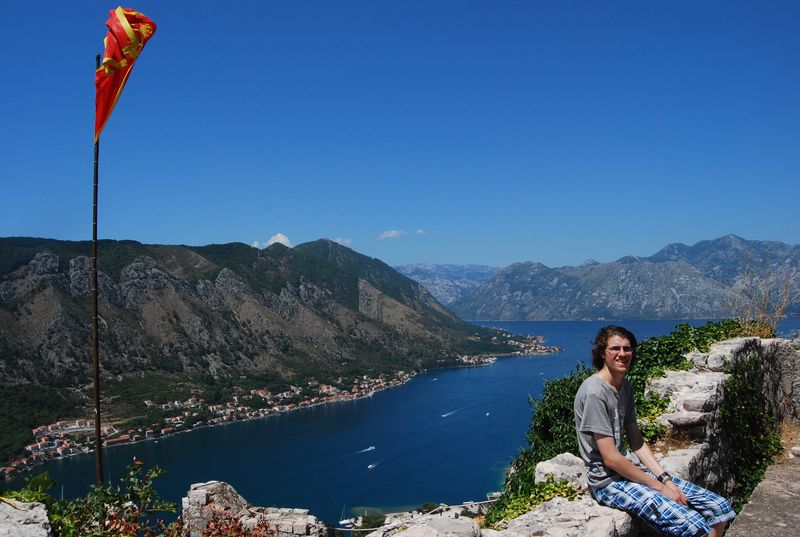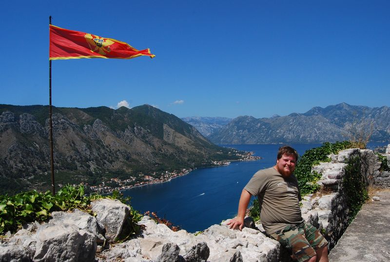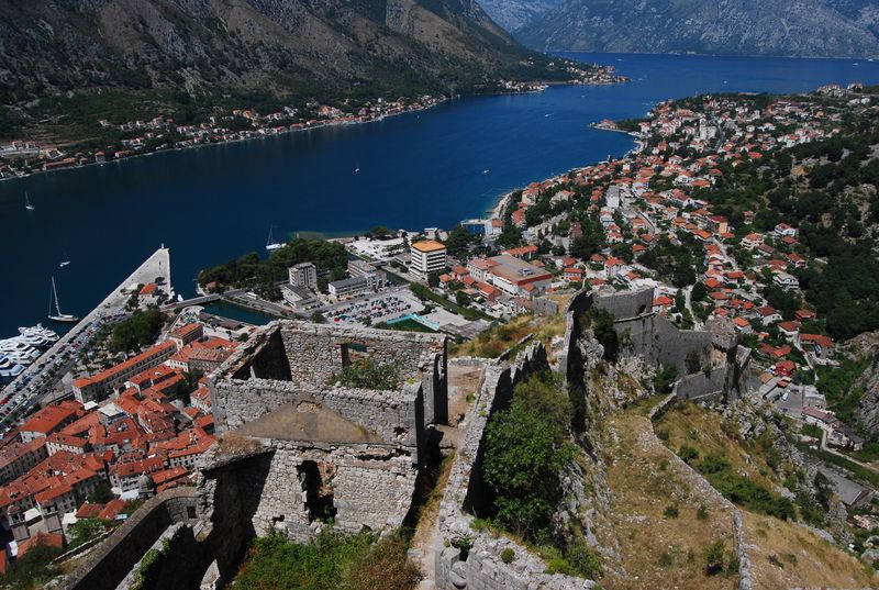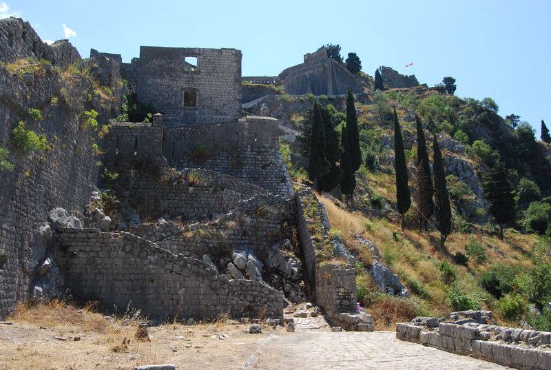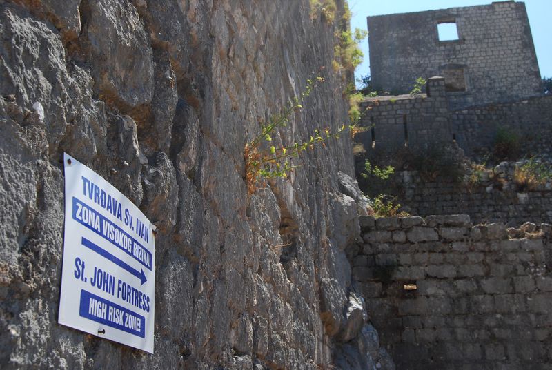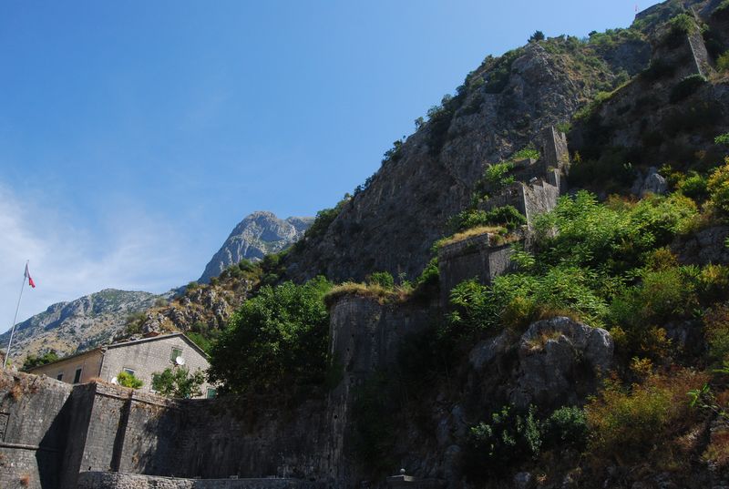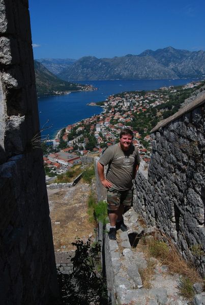 Na dann auf! Der „Eintritt“ kostete 3 EUR und es ging sofort sehr steile Treppen hinauf. Irgendwann wurden die Treppen brüchiger und irgendwann fehlten sie ganz, darauf hingewiesen wurde mit einem Schild „High Risk Zone“. Die Aussicht auf Kotor und den Fjord war genial. Und je höher wir kamen, desto besser wurde sie. Wir mußten zwar öfters anhalten und kurz Luft schnappen, doch schafften es tatsächlich ganz hoch auf die Festung, wo die montenegrinische Fahne hoch über dem Fjord im Wind flatterte. Unsere Hemden waren durchnäßt und unser Wasserhaushalt über Gebühr strapaziert. Zur Belohnung gönnten wir uns das hoffnungslos überteuerte aber wenigstens eiskalte Wasser in der Halbliterflasche für 2,50 EUR, was ein fleißige Montenegriner hier hoch transportiert hatte und nun unter der Hand verkaufte.