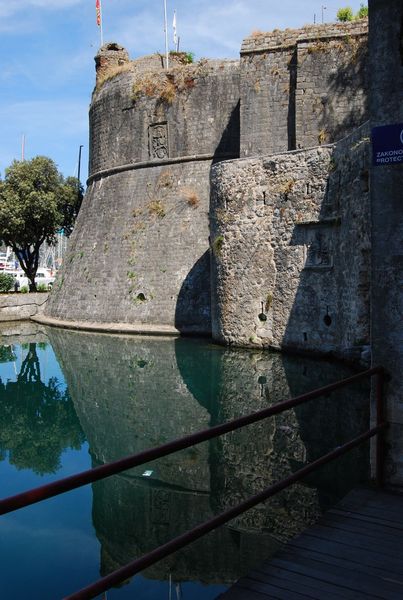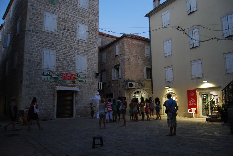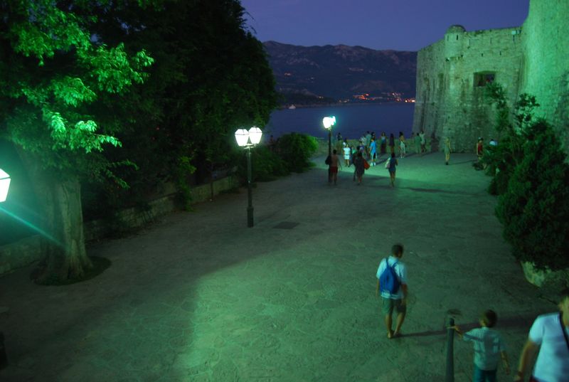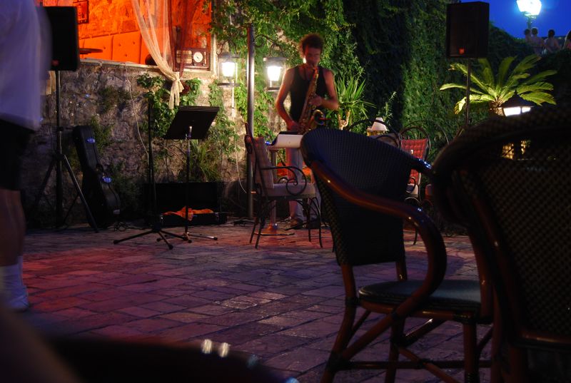 Nach weiteren 15 Minuten erreichten wir den Ausgangspunkt und bogen links ab in Richtung Altstadt. Linkerhand gab es einen Jahrmarkt und dann kamen wir auch schon an die Küstenlinie. Rechts ab dauerte es noch gute 30 Minuten entlang eines freßtempelgesäumten Weges bis zur Stadtmauer. Wir machen einige Photos, auch wenn ich langsam nach Venedig, Dubrovnik und Kotor den Schöne-Altstadt-Overkill bekam. Der Durst plagte, die Füße ebenso, also folgten wir einem Schild der zur der Cocktailbar „Buster Keaton“ führte. Dort gab es auch Bier frisch vom Faß für 1,90 EUR sowie gute Livemusik und eine sehr angenehme Atmosphäre. Wir hielten es hier mehrere Runden Bier aus und ich aktualisierte mit dem Laptop den Reisebericht.