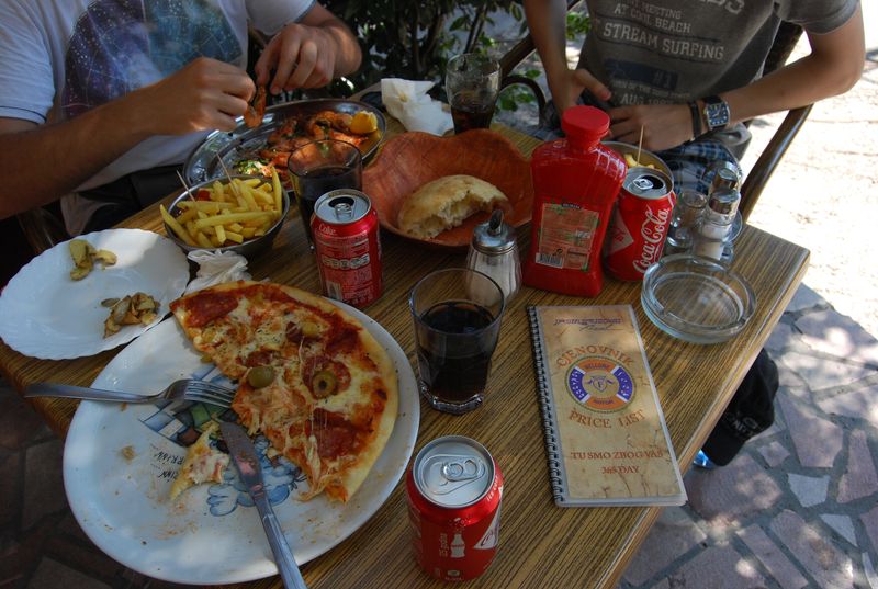 Wieder unten angekommen erreichten wir einen von Gott gesandten Brunnen, an dem wir uns abkühlten und machten uns dann auf die Essenssuche. Die Restaurants in der Altstadt waren vergleichsweise teuer, also liefen wir in Richtung des Einkaufszentrum Kamelijka, das wir gestern Nacht noch für ein Hotel gehalten hatten, und fanden kurz davor das Restaurant „Fortuna Foods“. Scampis für 5 EUR, sehr leckere Pizza für 6 EUR und die große Portion Pommes 1,50 EUR.
