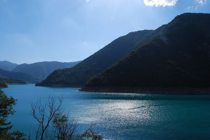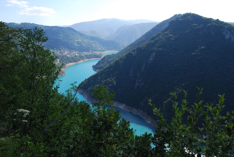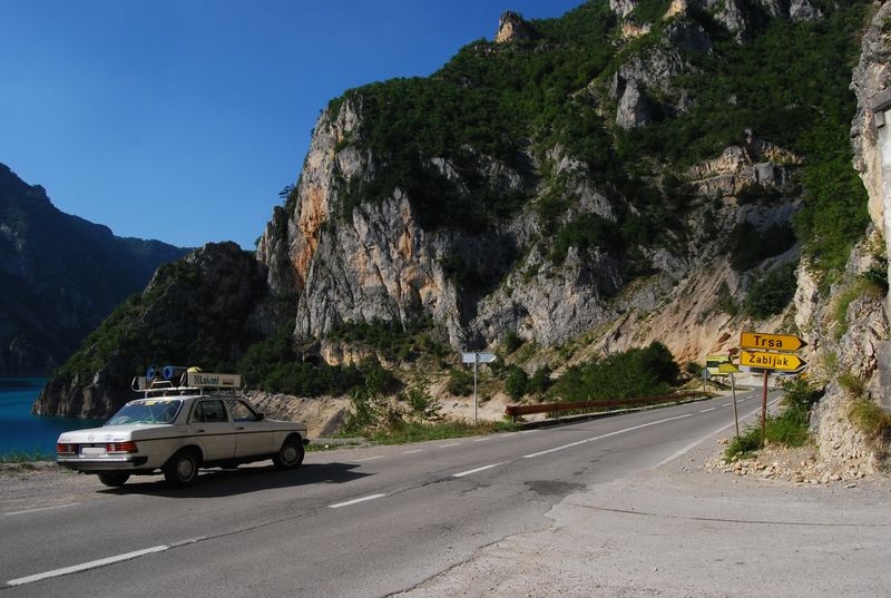 Wir fuhren durch den Wald, steil bergab und kamen zum Pivastausee (Pivsko jezero - w), der durch sein sehr klares und stechend blaues Wasser beeindruckte. Leider fanden wir keinen Strand und zogen unverrichteter Dinge weiter, wieder zurück gen Budva.