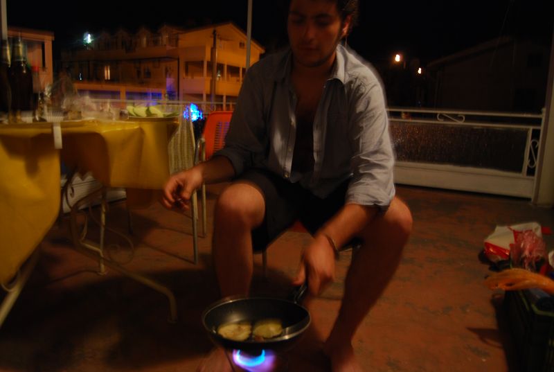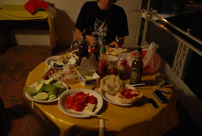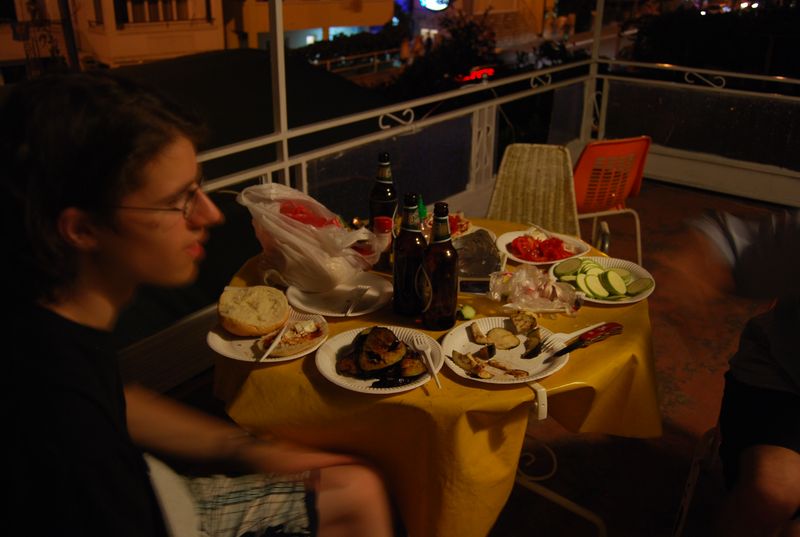 In Budva kauften wir noch fix ein paar kühle Bier, die Sonne war gerade untergegangen. Leider war die komplette Straße zugeparkt, also ließ ich Taylan und Jonas raus und fuhr zum Kreisel an der Hauptstraße und stellte den Wagen für 2 EUR die Nacht auf einen bewachten Parkplatz. Der eine Kunde in der Bäckerei sagte gestern sowieso, mit unserem Auto würde hier ganz schnell „zapzarap“ gemacht, wenn es auf der Straße steht. Es ging ja eine Nacht gut, man muß das Glück ja nicht überstrapazieren. Wir machten eine leckere Gemüsepfanne und ließen den Dakhla-Döner neu aufleben – denn wir aßen das ganze im Fladenbrot, so wie letztes Jahr in Marokko, wo diese Wortschöpfung entstand.