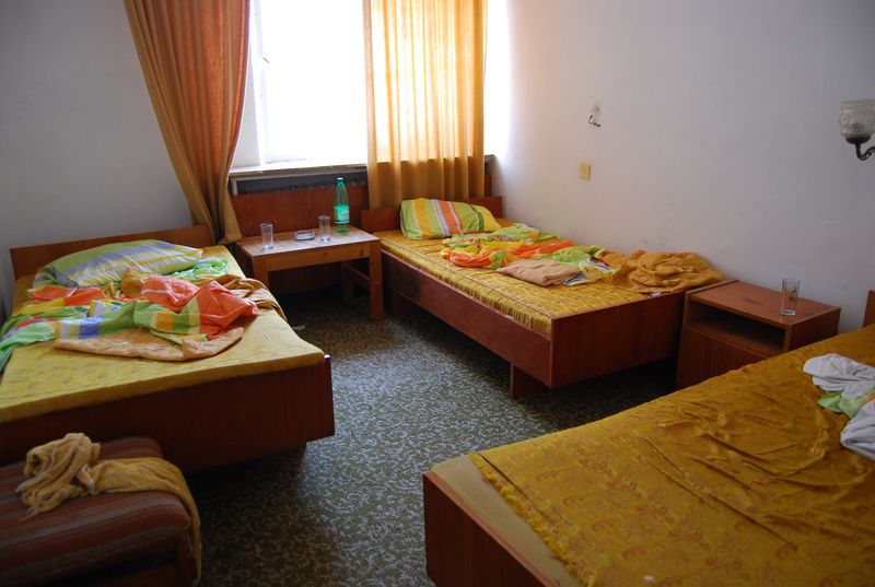 Das erste Motel war abgeschlossen, niemand an der Rezeption. Das zweite in Klokotnitsa hatte kein Zimmer mehr frei, aber der englischsprachige Besitzer sagte, 5 km weiter käme rechterhand ein riesiges Motel, das man von der Straße aus schon sehe. Tatsächlich hatte es eine Leuchtschrift, sodaß man es erkennen konnte, obwohl es etwas abseits lag (41°58'31.77"N 25°31'46.41"E). Mich verstand auf Englisch und Deutsch niemand, der Securitymann sagte einige Sprachen auf, die er beherrschte, darunter Spanisch. Aber auch meine kärglichen Kenntnisse auf diesem Gebiet reichten nicht aus, um alles zu klären. Glücklicherweise konnte er aber Türkisch, sodaß ich Taylan aus dem Auto holen und vorschicken konnte. Die beiden klärten die Angelegenheit in einem sehr heiteren und ausschweifenden Gespräch. Das Zimmer kostete lächerliche 25 EUR die Nacht, es war einfach, aber in Ordnung, und wir bekamen sogar noch Mineralwasser aufs Zimmer. Es gab ein offenes WLAN, ob aus dem Hotel oder von draußen, und recht schnell waren wir im Land der Träume.