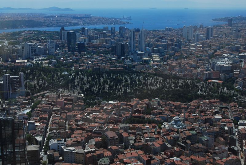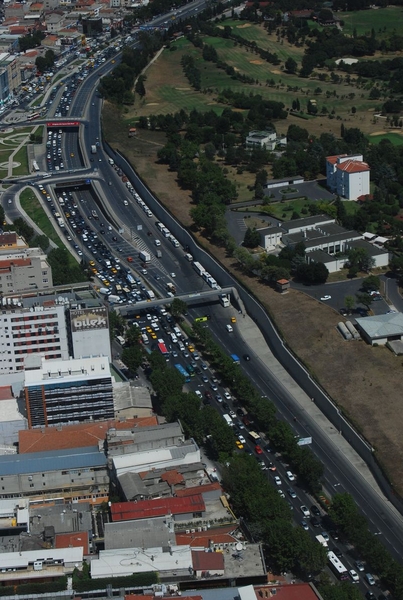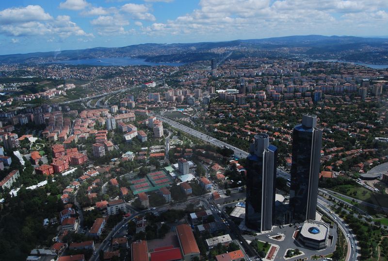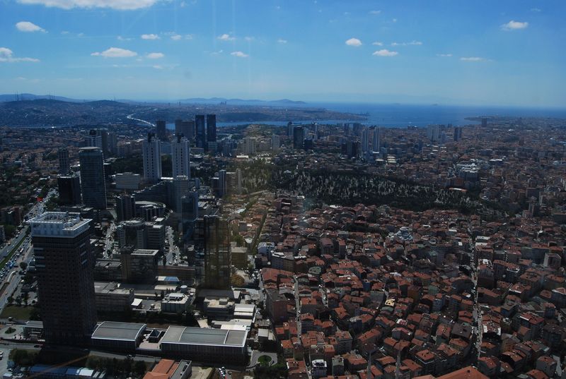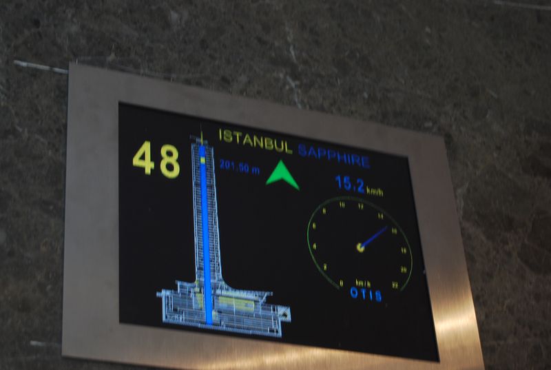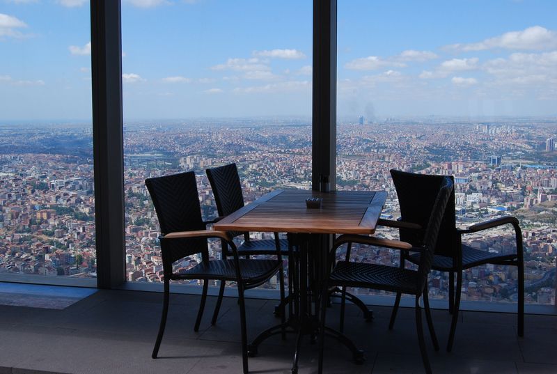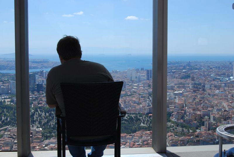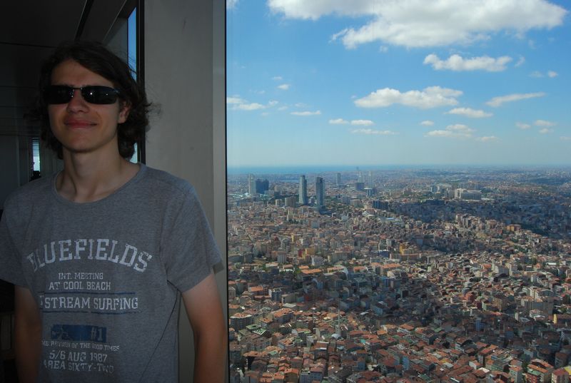 Heute standen der Sapphire of Istanbul (w) und die Cisterna Basilica (w) auf dem Plan. Wir liefen zum Sapphire, der nicht allzuweit entfernt war. Im Foyer gab es allerhand Läden und moderne Fastfoodketten, die jedoch größtenteils wegen Ramadan ausgestorben waren. Obwohl wir unsere Studentenausweise vergessen hatten, konnten wir nach kurzem charmanten Schnack mit der Kassiererin zum Studententarif von 12 TL nach oben fahren. Der Fahrstuhl katapultierte uns in Nullkommanix auf die Besucherterrasse in über 200 m Höhe. Die Aussicht war atemberaubend, durch die großen Fenster konnte man sich fast die gesamte Stadt ansehen und hatte einen Blick vom Schwarzen Meer bis zum Marmarameer. Unten konnte man den Istanbuler Verkehr wie kleine Ameisen in ihrem Bau sehen. Insgesamt sehr zu empfehlen.