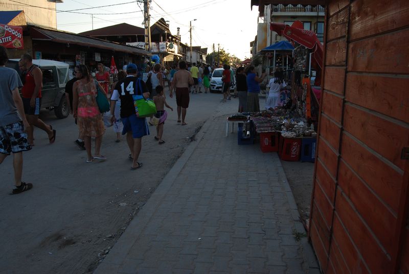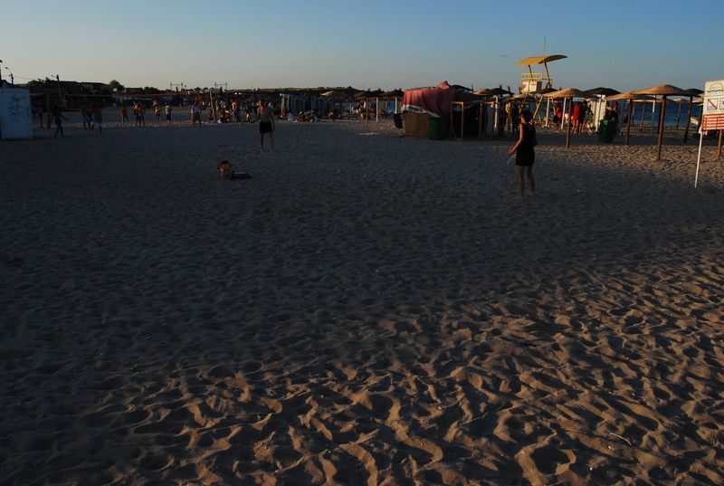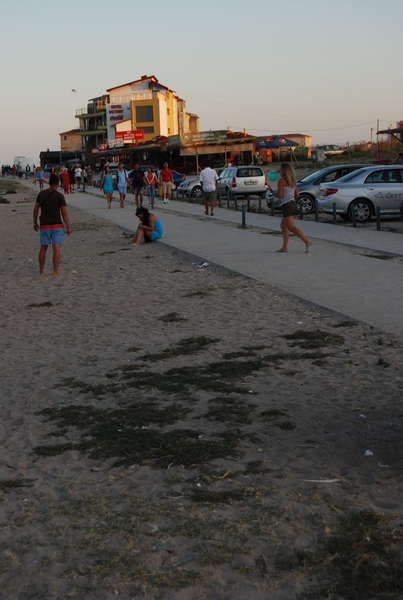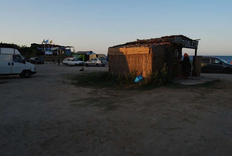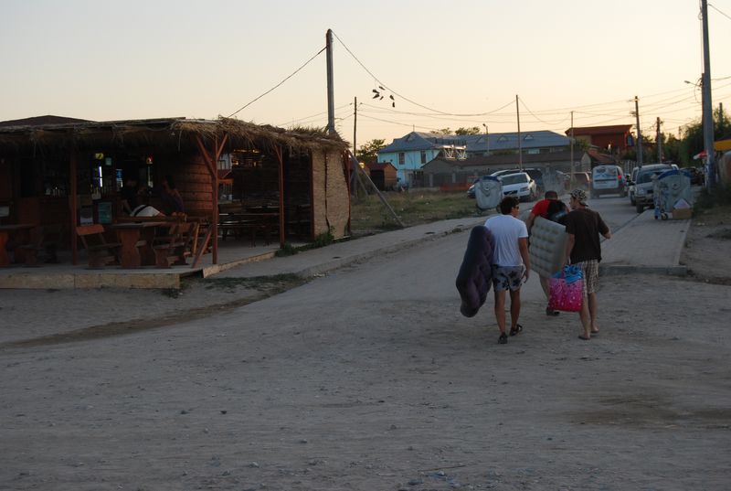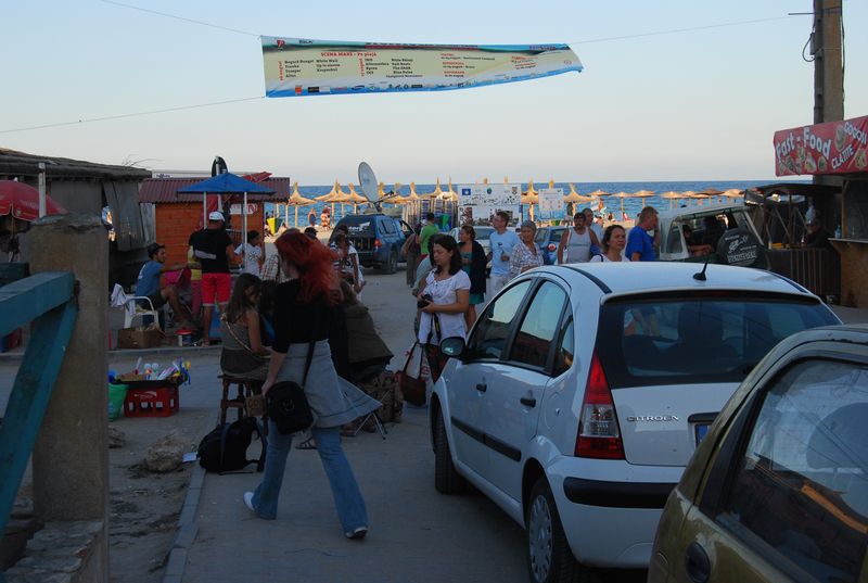 Die bulgarische Ausreise fand ganz einfach nicht statt. Die Rumänen winkten uns durch, als sie die deutschen Pässe sahen. Land 14 der Reise. Den Geldwechsel verschoben wir auf den Ort, der 1 km später folgte. Wenn man es nicht besser wüßte, könnte man bei der bloßen Durchfahrt von einem ganz normalen rumänischen Dorf ausgehen, doch schon eine Seitenstraße später sieht man hunderte fröhliche Jugendliche feiern und allerhand an Kneipen und Buden. Wir fuhren mit dem Daimler quer durch, bis zum Strand, wo es aber erst mal nur einen Parkplatz gab.
