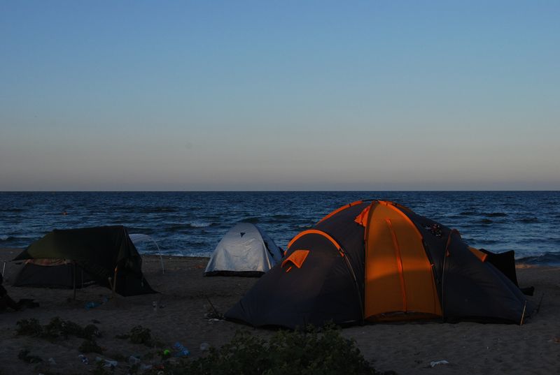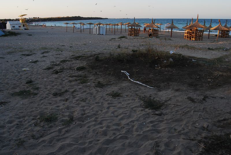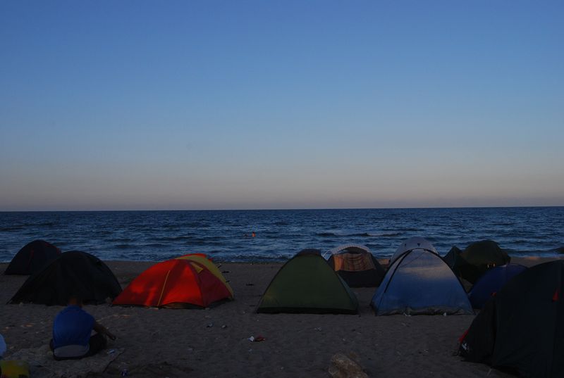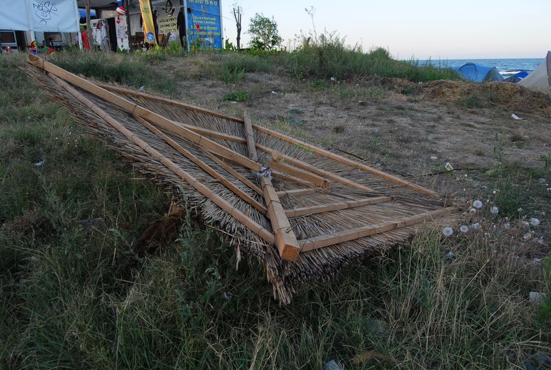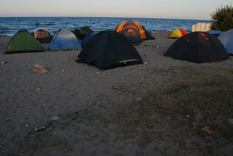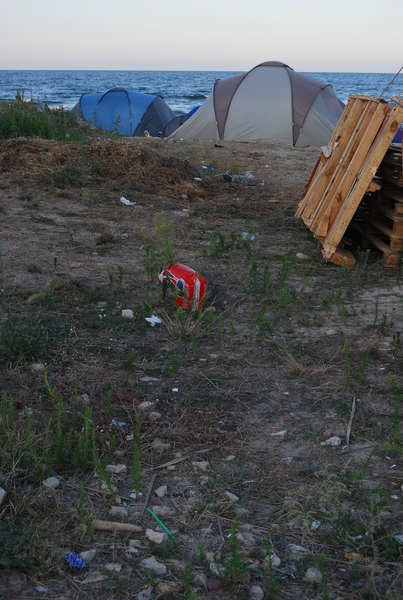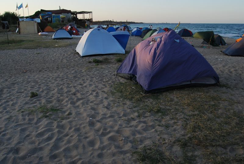 Wir düsten auf dem Sand wieder vom Geschehen weg, wo es nach 500 Metern dann den Strandabschnitt gab, der zum Zelten freigegeben war. Wir stellten das Zelt auf und fuhren zur Grenze zurück, um Geld zu wechseln. Im Ort gab es keine Wechselstube und Jonas und Taylan setzten noch auf Bargeld statt auf Kreditkarte. Die Wechselbude hatte aber gerade schon zugemacht. Also wieder zurück, ich mit der Kreditkarte an den Automaten und mit den anderen Rumänische Mickeymaus in Euro getauscht. Wechselkurs: ugf. 4,2 Lei für 1 Euro. Rumänien hat sehr moderne Geldscheine aus Plastik (!). Ein wirklich ungewohntes Gefühl, aber dafür halten die Scheine sehr viel länger und können kaum aus Zufall zerstört werden.