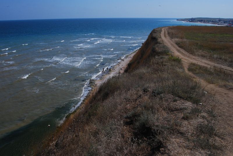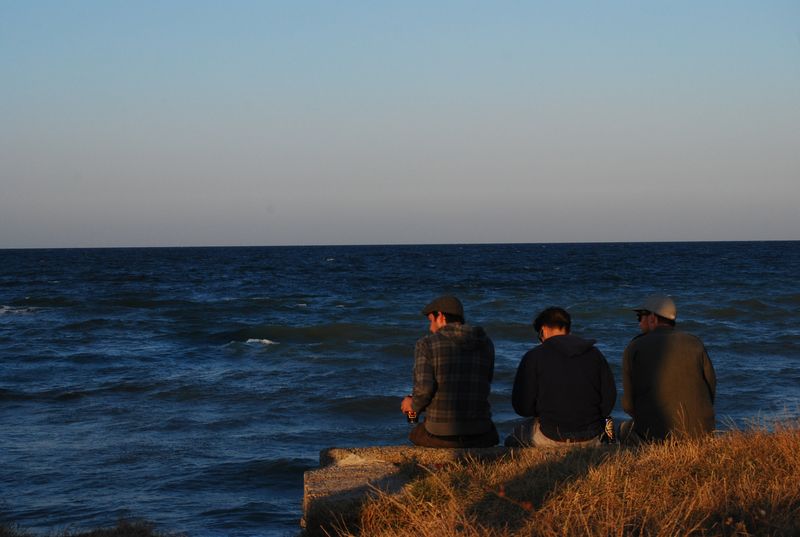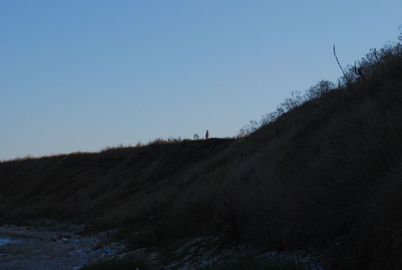 An einer geeigneten Stelle kletterten wir vom Strand hinauf auf die Böschung und liefen in Richtung des Mannes. Die Szene war etwas surreal. Er war bulgarischer Offizieller, wie man an seinem kyrillisch beschriebenen Aufnäher auf der Uniform sehen konnte, und war hier ganz alleine. Er hatte einen alten Holzstuhl, um sich bei seiner wichtigen Aufgabe hin und wieder kurz ausruhen zu können. Der Grenzer schwieg uns an, als wir zu ihm kamen. Ich fragte, ob sein Standort die Grenze sei. Ja, das war sie. Ich fragte, ob ich ein Bild von der Grenze machen dürften. Leider war das verboten, oder er wollte es nicht. Er war dabei jedoch weder aggressiv noch freundlich, sondern fast gleichgültig. Als wollte er in seinem hehren Ziel nicht gestört werden, sah er als wir bei ihm waren immer wieder durch sein Fernrohr auf das Meer und lief ständig ein paar Meter hin und her.