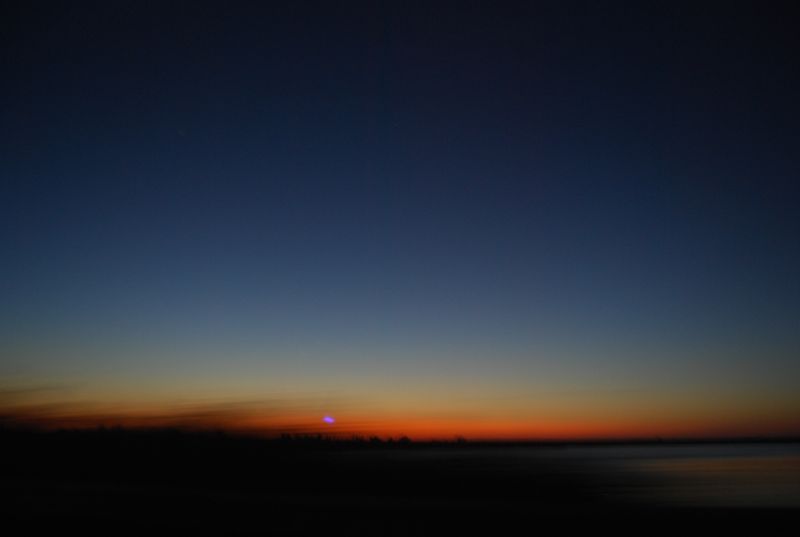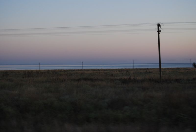Dort, wo die „Autonome Republik Krim“ (w) beginnt, befand sich ein kleiner Komplex, der ein wenig nach Grenze aussah. Ein Militär stand herum und sah sich die Autos an, die vorbeikommen, hielt aber niemanden an. Die Konzentration an Fliegen nahm deutlich zu, bald war die Frontscheibe dicht. Das Wischwasser war leer. An einer Tankstelle fragte ich, ob es hier was zum Saubermachen oder zu kaufen gab. Man verstand nichts und konnte mir nicht weiterhelfen. Später gab es dann halt Spüli und Wasser aus dem Kofferraum. Wir bogen in Richtung Portove ab, wo wir hofften, einen Platz zum Wildcampen am Meer zu finden. Der Ort sah ziemlich ärmlich aus, über einen Feldweg erreichten wir eine große Freifläche am Strand, wo wir einen Platz ausloteten und, als wir uns einig waren, daß es hier einigermaßen sicher ist, das Zelt aufbauten. Es ging ein guter Wind, mit den Schnüren banden wir das Zelt am Dachgepäckträger fest und kochten im Schein der Standlichter Nudeln. Sonst war es stockduster, nur ein paar Leuchtpunkte der Häuser des Ortes waren zu sehen. Es war noch angenehm warm und wurde auch zur Nacht nicht kalt. Hin und wieder fuhr ein Moped über die Fläche, interessierte sich aber nicht für uns. Vielleicht war das die Küstenwache.