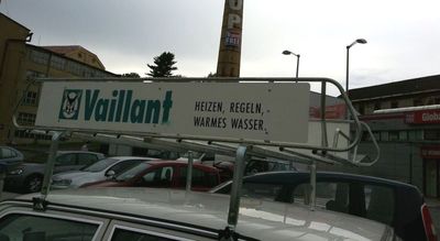 Ein sehr freundlicher, ungefähr 40-jähriger Herr empfing mich und baute den Träger eher für mich als mit mir auf und half mir bei der Montage auf dem Dach. Für den absolut unterirdischen Preis unglaublich! Ähnliche gebrauchte Träger in der Region Wiesbaden gingen um die 100 EUR weg. Ich rundete den Kaufpreis großzügigst auf und gab Trinkgeld. Ostdeutsche sind doch irgendwo die besseren Menschen, sowas hätt' ich daheim bestimmt nicht erlebt. Die Halterungen waren für einen Kleintransporter gedacht, weswegen der Träger sehr hoch abstand. Ich gab sie Flo, einem Freund, seineszeichens Karosseriebauer, zum Flexen und Schweißen und schon stand das Ding wie eine eins und konnte beladen werden. Da ich keine Werbung fahren wollte, kaufte ich mir zwei Spraydosen und machte kurzerhand aus Vaillant „Laivant“ (leiwand, österreichisch: toll, grandios).