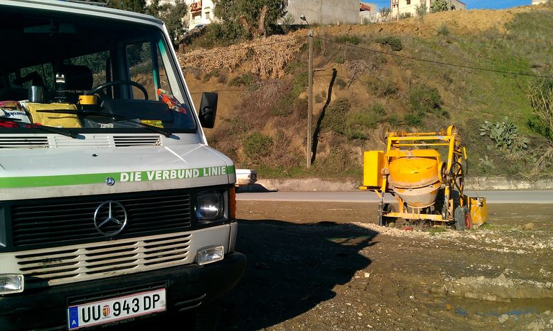 In Ahfir angekommen – der Grenzstadt zu Algerien – war es leider schon stockfinster und das eigentlich obligatorische Grenzphoto mußte ausfallen. Einen Ort weiter roch es überall nach Gegrilltem, und da es noch nichts warmes zu essen gab hielten wir an einem Stand, wo Köfte auf einem ehemaligen länglichen Blumentopf gegrillt wurde. Hier fragten wir ebenfalls nach einem Schlafplatz, man bot uns an, im Hof nebenan zu schlafen. Da wir schon sehr müde waren blieben wir einfach noch eine Zeit lang sitzen, bis wir müde genug waren, dort im Bus zu schlafen.