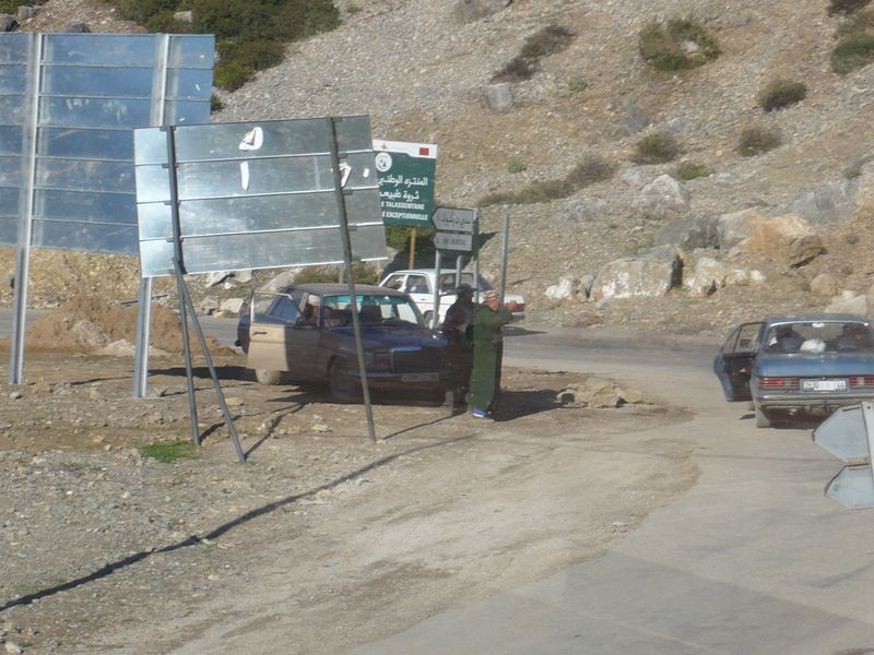 Es zog sich leider wegen der vielen Kurven und der immer noch suboptimalen Vorderachse ewig hin, langsam wurde es dunkel und wir suchten nach einem halbwegs passablen Schlaf- oder Campingplatz. An einem Kreisverkehr bei Ahfir fragte Große – der einzige an Bord der halbwegs Französisch konnte – einen Polizisten, der uns in einem absolut mustergültigen Hochfranzösisch antwortete. Es gab leider keinen Campingplatz, dafür bot er uns an, auf dem Parkplatz der Polizeistation zu schlafen. Wir wollten aber schon irgendetwas besseres haben und fuhren daher weiter.